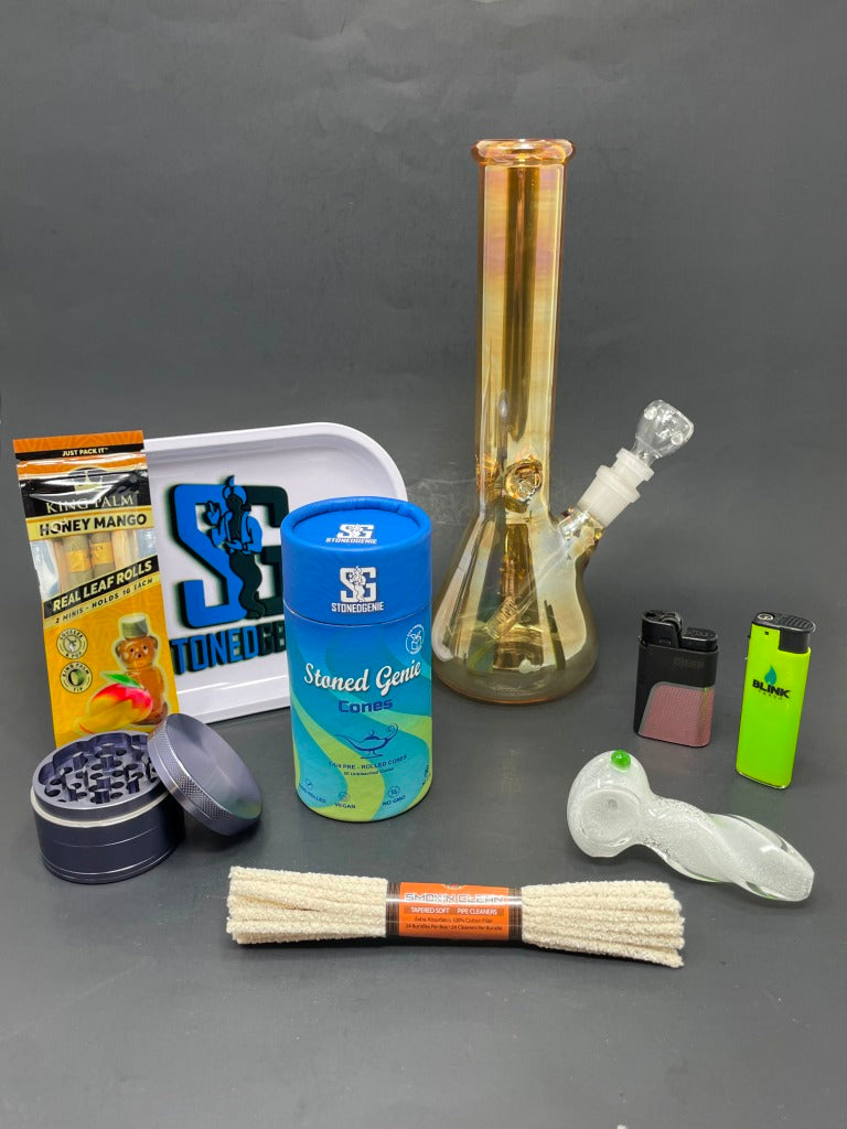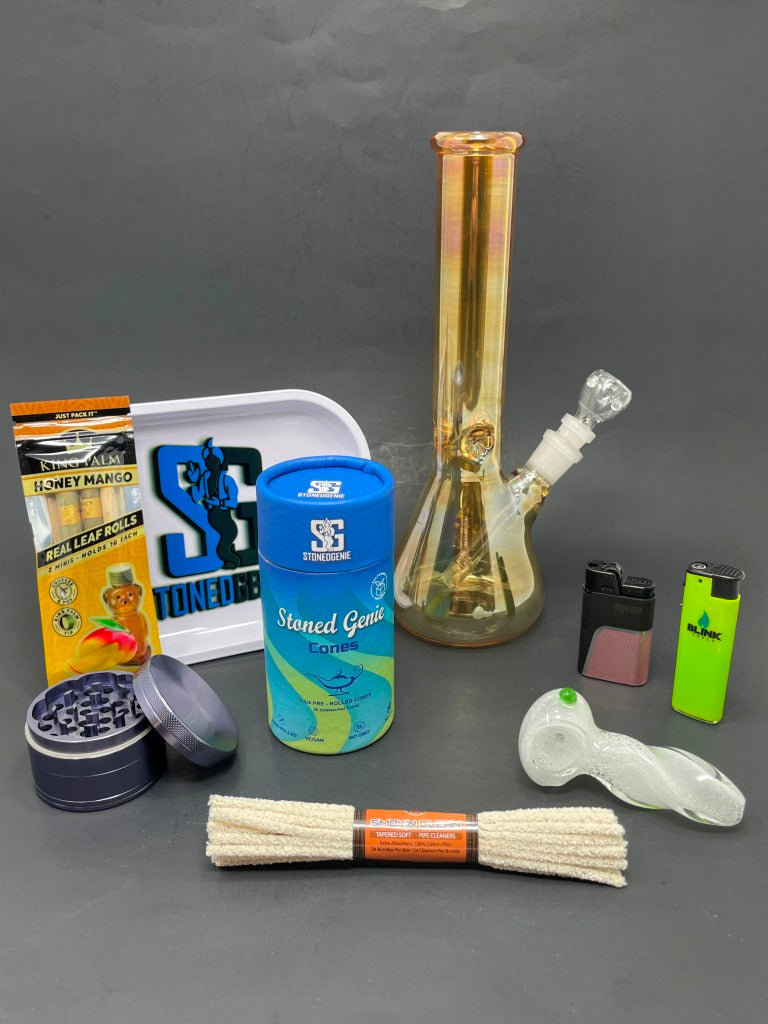 The Sunset Smoke Kit offers everything you need for a smooth and enjoyable experience. Featuring a vibrant 10" Orange Iridescent Beaker Base Bong and a handy Stoned Genie Rolling Tray, it keeps your setup organized and stylish. The 3.5" Twisted Glow in the Dark Hand Pipe adds fun and functionality for on-the-go use. Included are a 56mm Premium Smoky Herb Grinder for a perfect grind, the reliable Blink Neon Wind Proof Lighter and elegant Djeep Lighter to keep you lit, plus King Palm Honey Mango-Mini wraps and a Pipe Brush Cleaner to maintain your gear effortlessly.