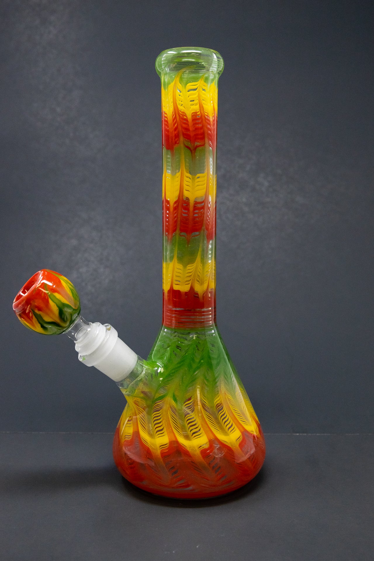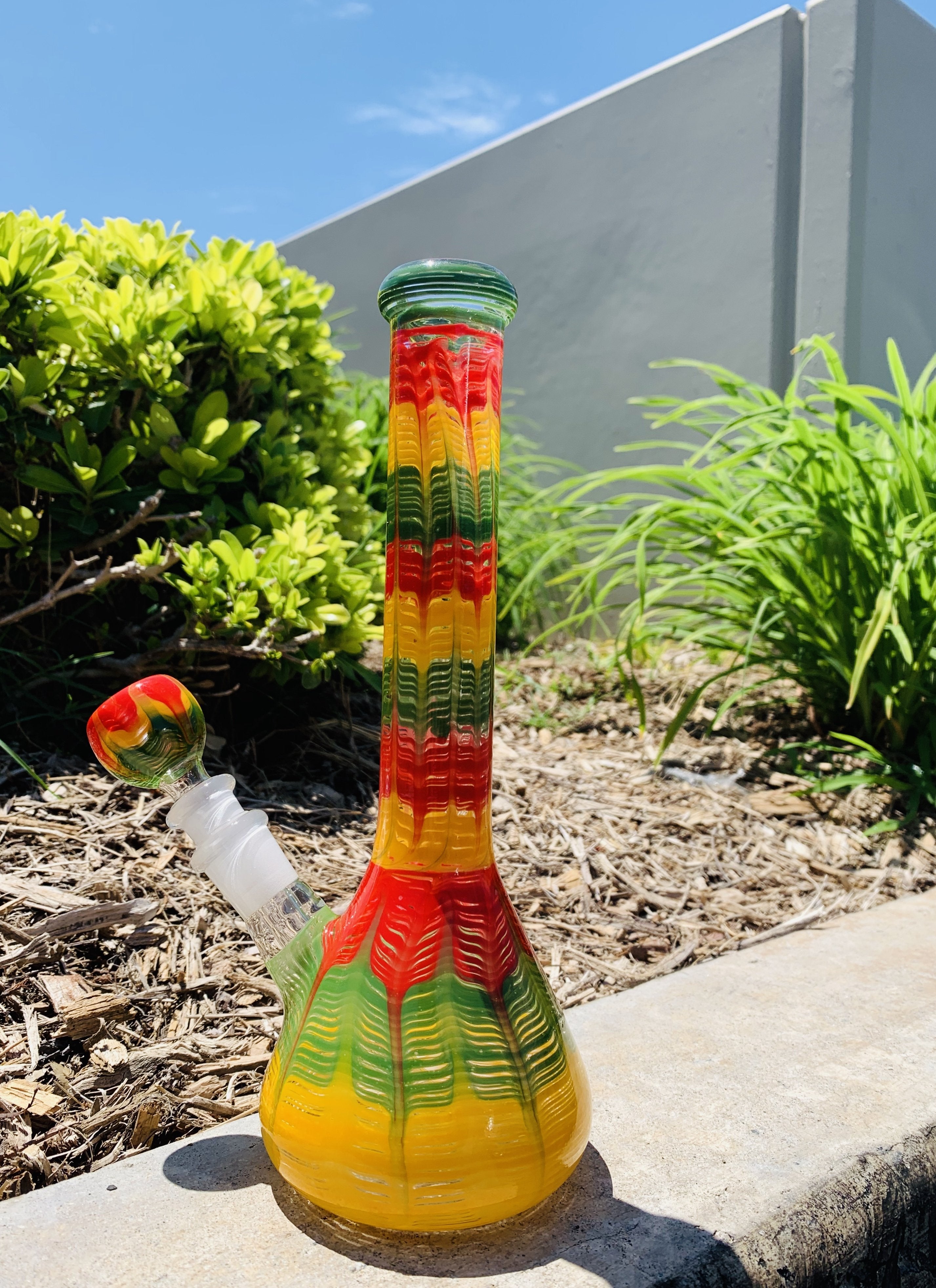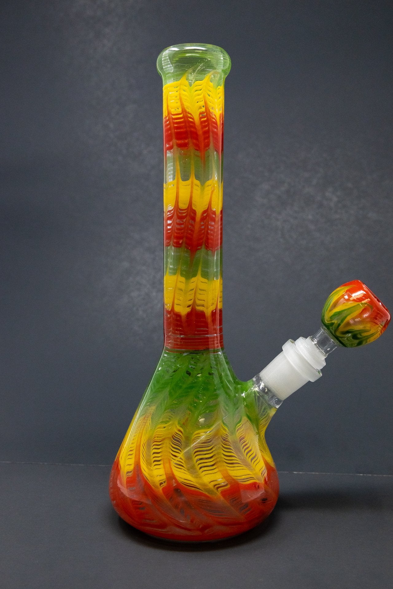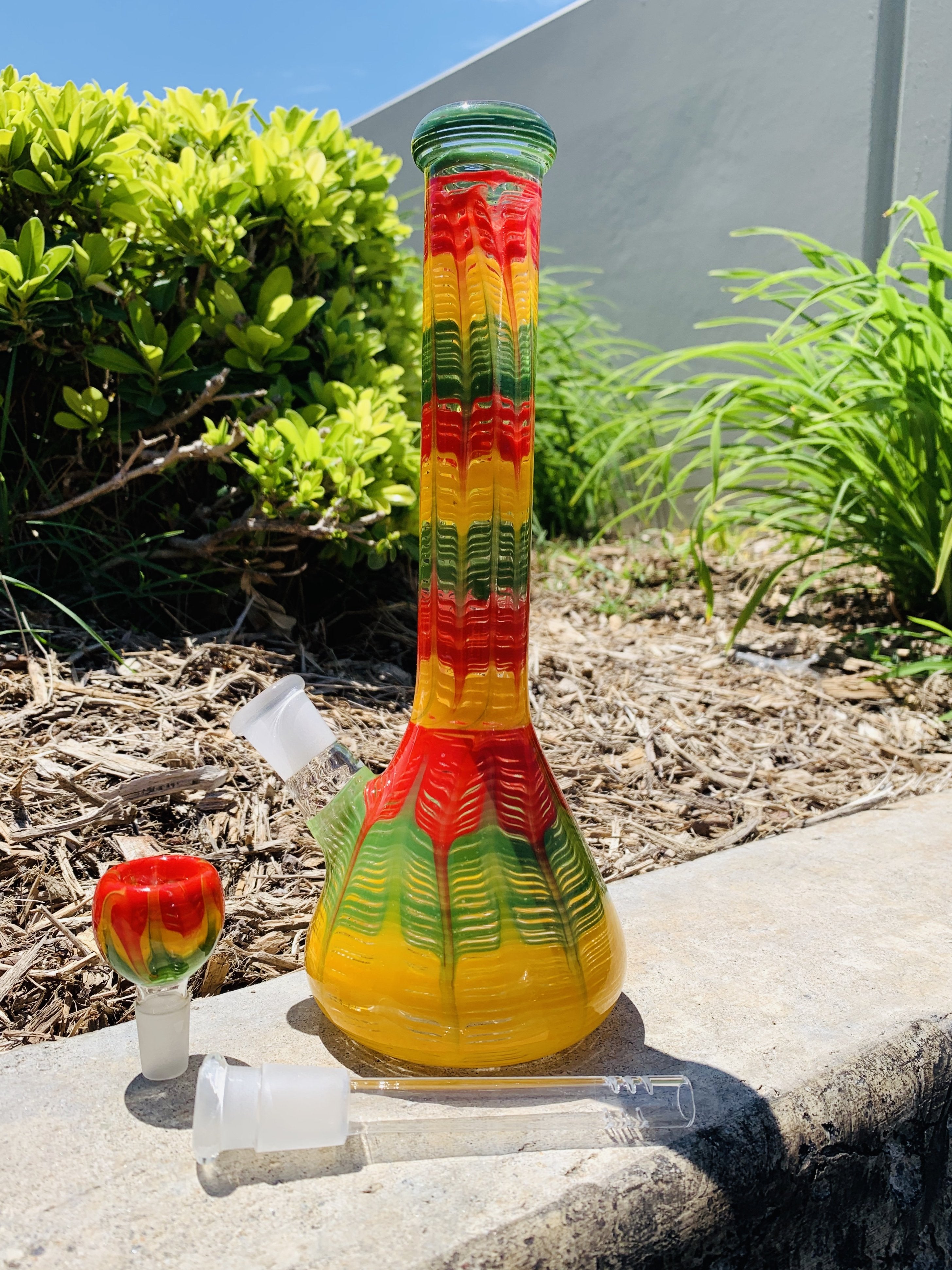 Smoke luxuriously with our beautiful rasta beaker base 10-inch designer bong! This is the perfect bong for an active smoker whether it be yourself or a close smoker friend, this bong is sure to last through sesh after sesh!