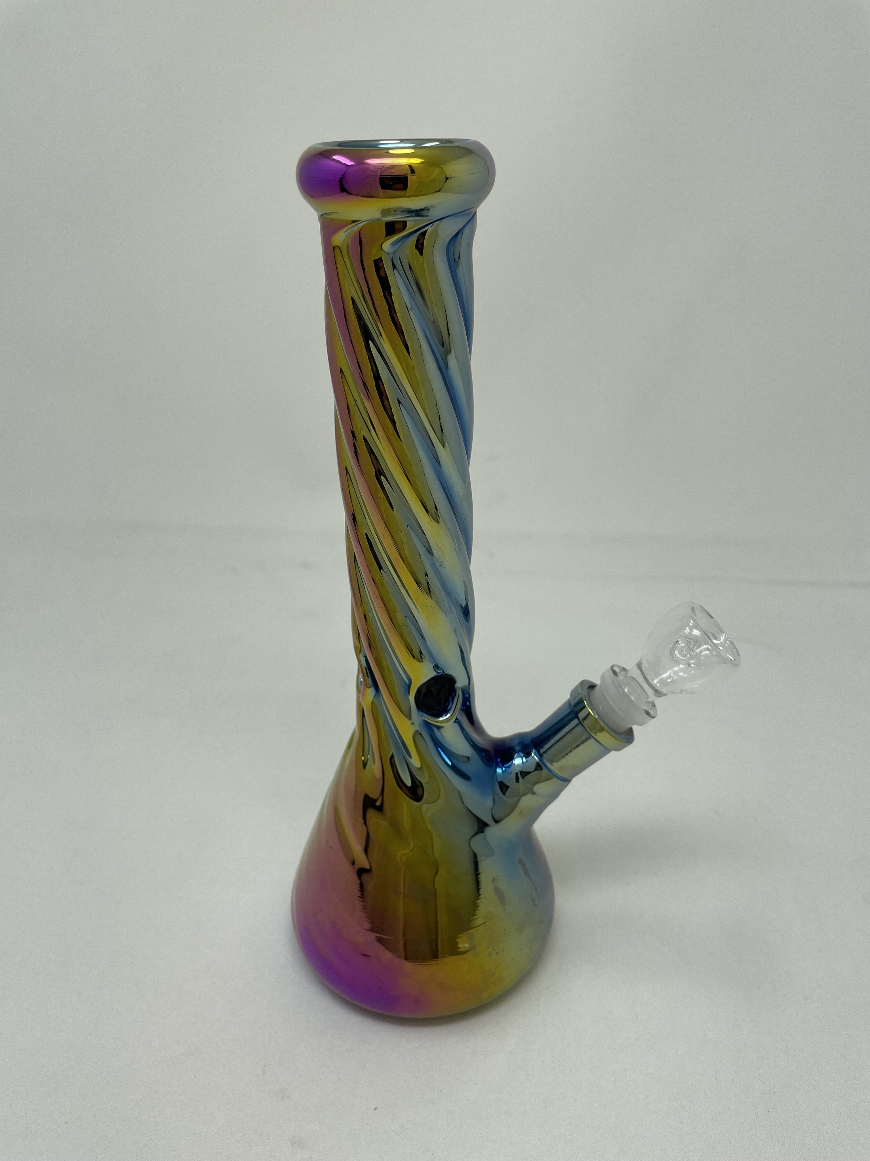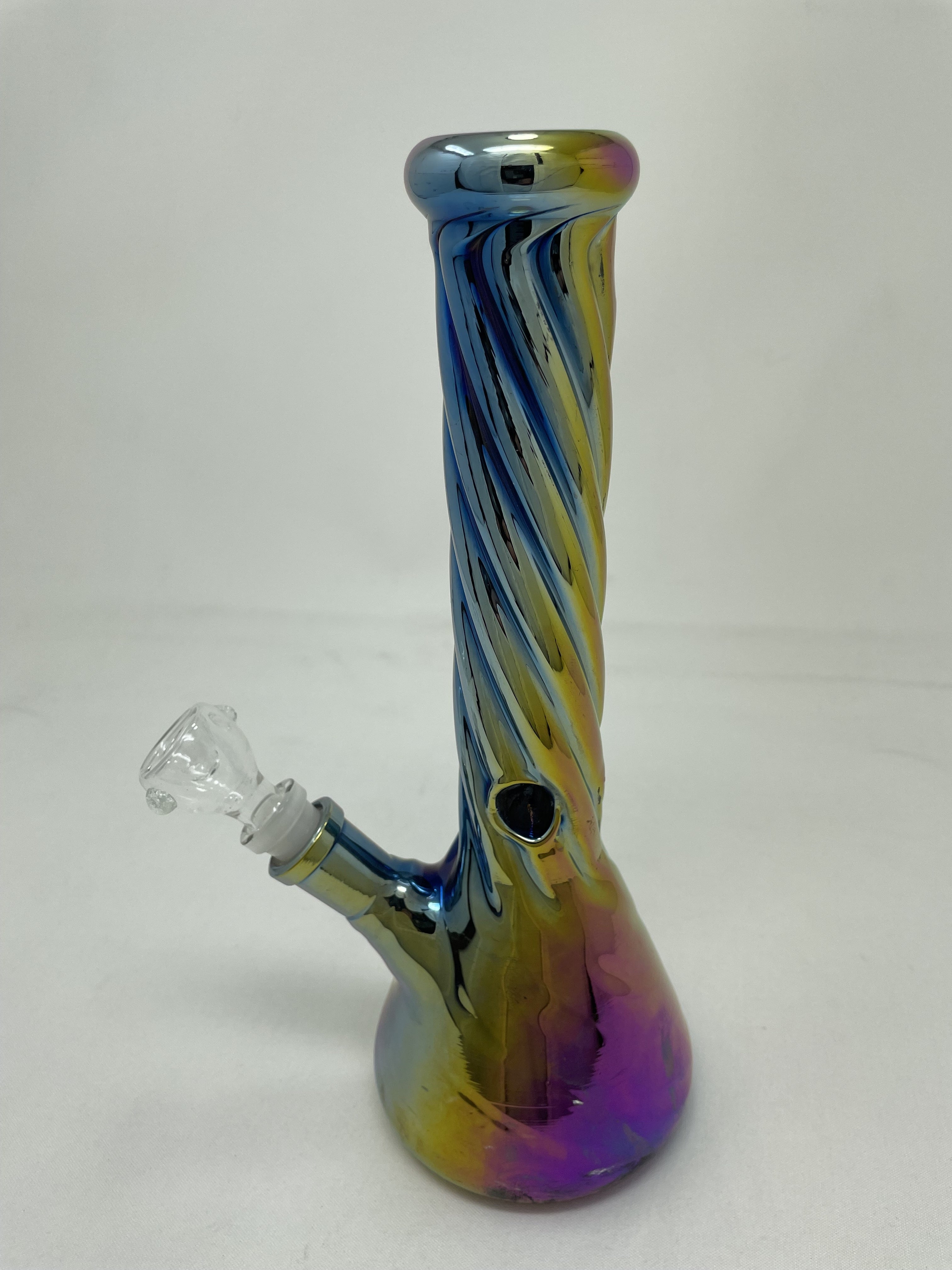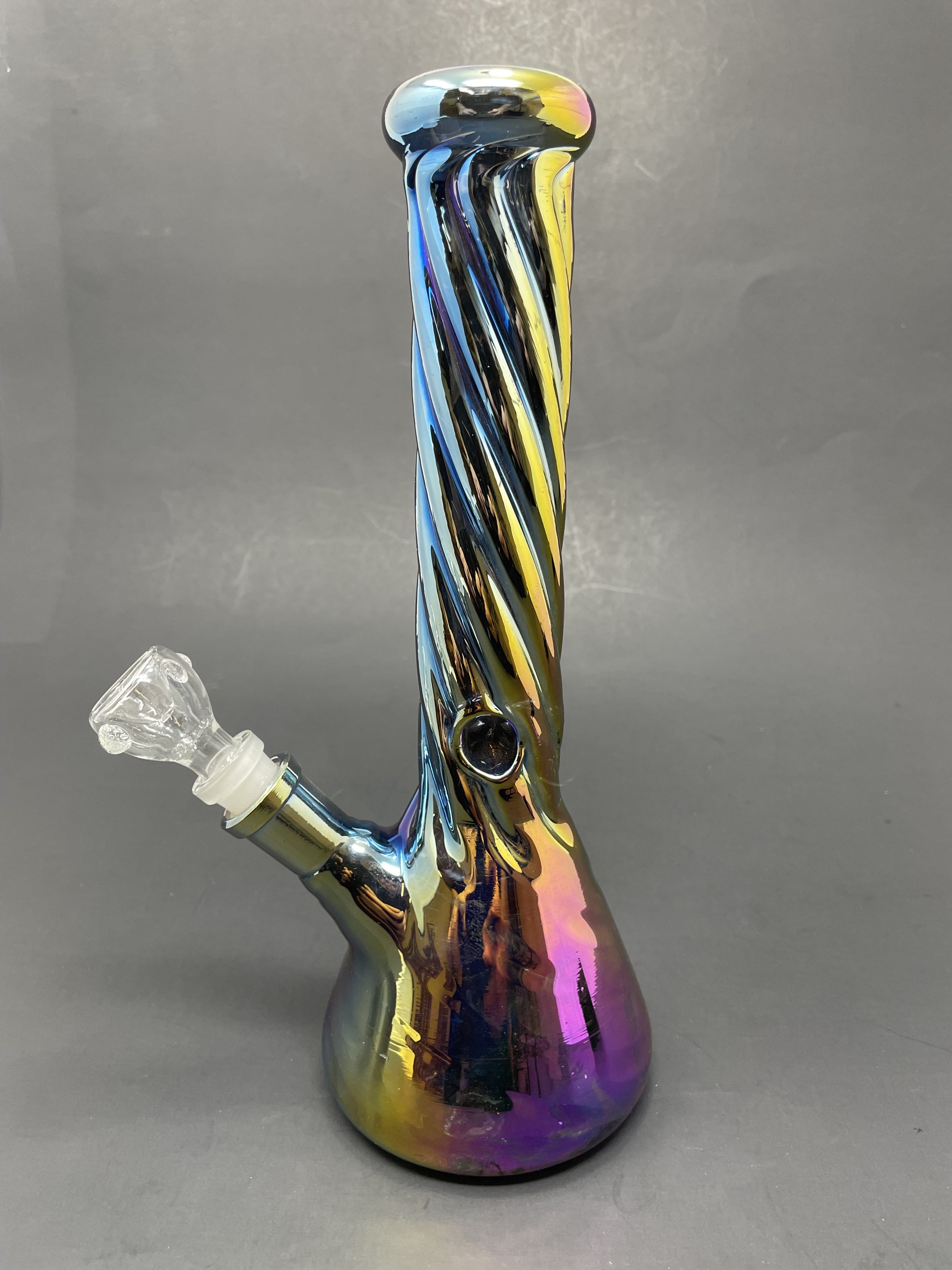 Elevate your smoking experience with our 10" Rainbow Plated Beaker Bong! Hand-crafted with durable borosilicate glass, this bong is made to last. The added ice catcher allows for a smoother hit while the thick/heavy design ensures a sturdy grip. Get ready for a colorful and smooth smoking experience.