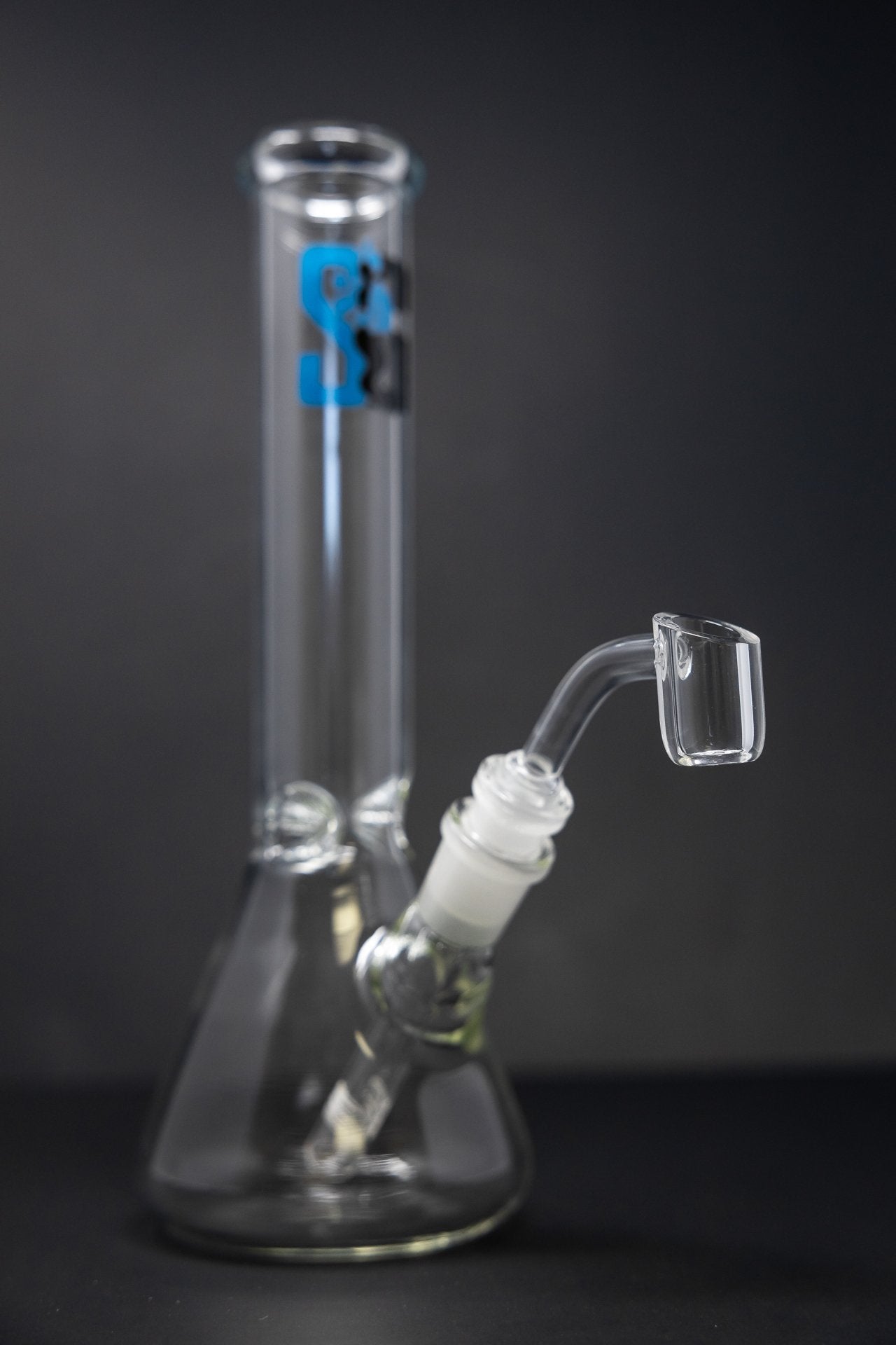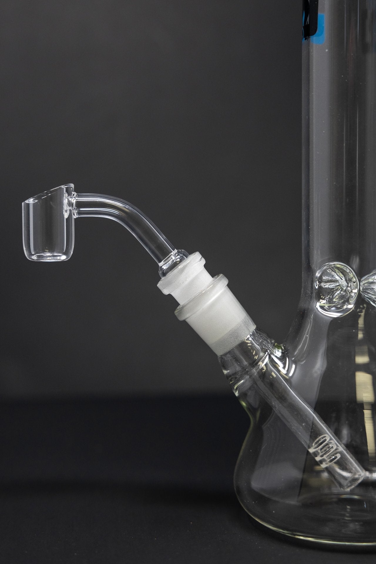 This banger is 14mm male quartz banger with 45° bend. This banger is made to turn a beaker bong or straight shooter into a dab rig. Opposed to the 90° joint bend this allows you to have the perfect angle to use your torch and dab tool safely. We've included a picture of it fitting our 10" Beaker bong to show the need for the 45° bend to convert that particular bong into a dab rig.
