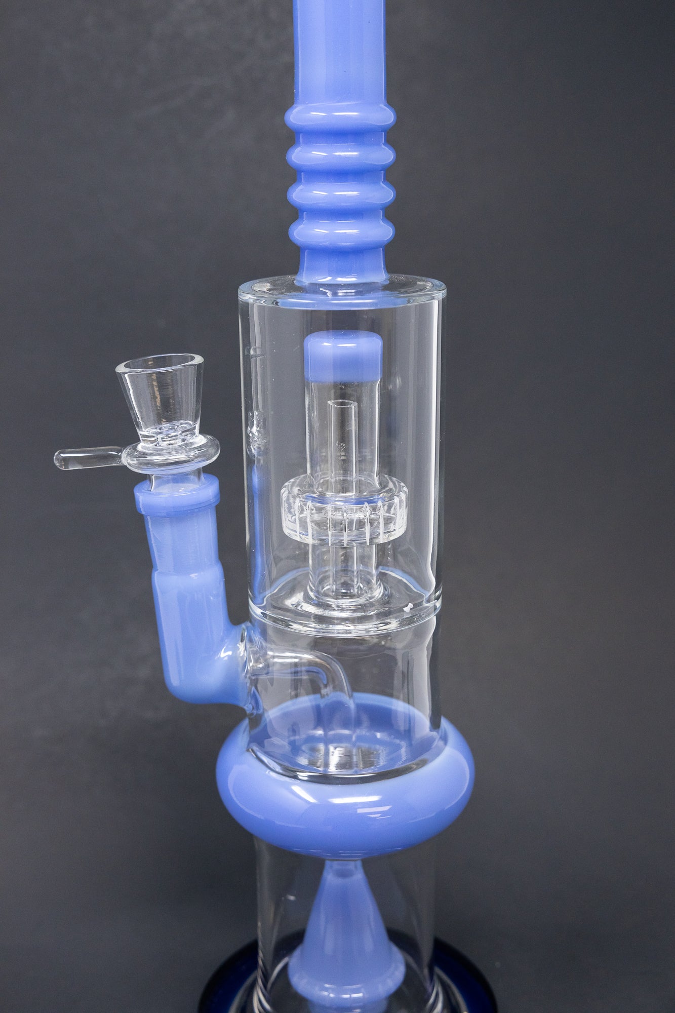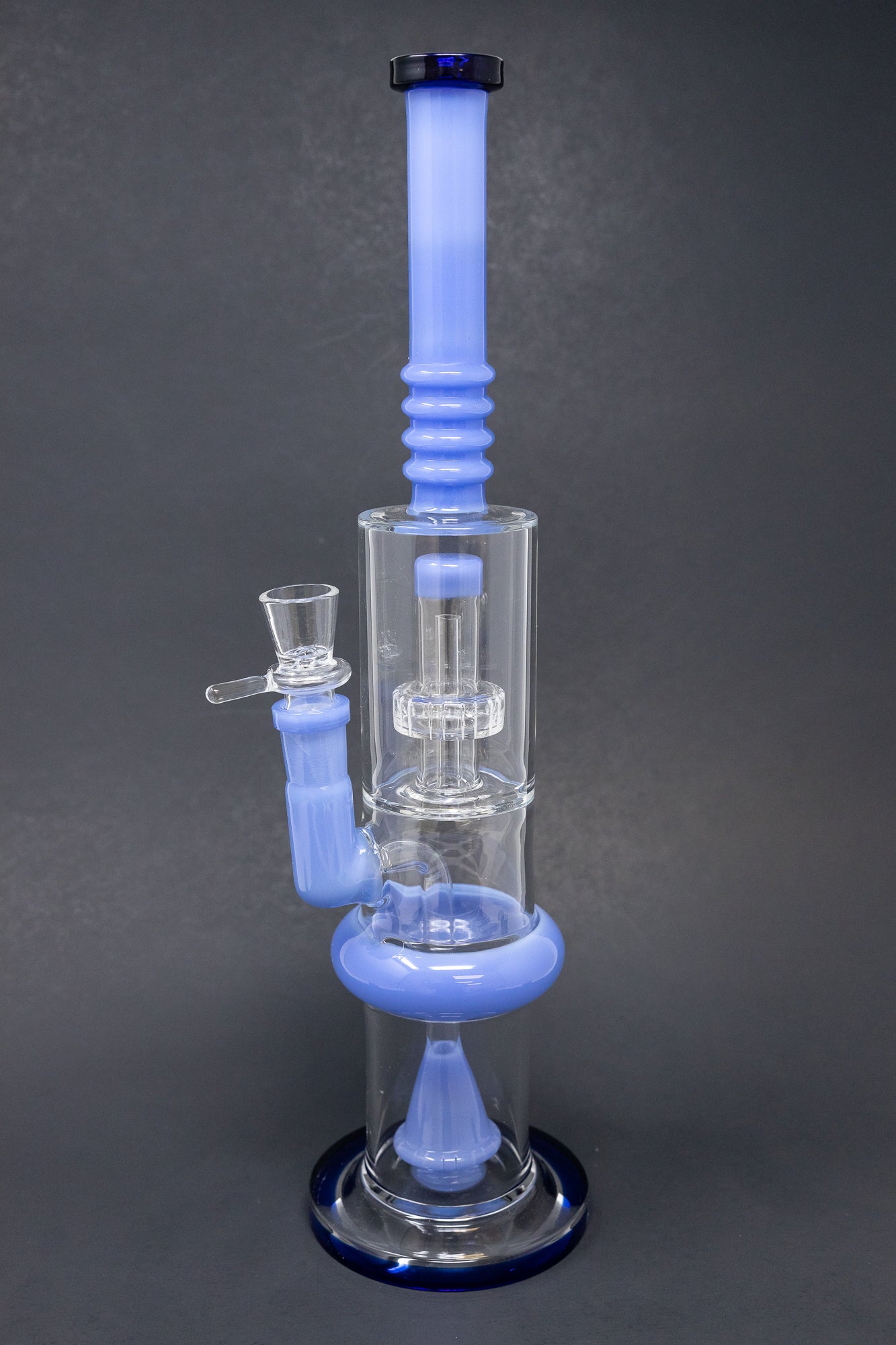 16" Flat Base Blue Double Percolator BongSkinny Neck Designed to serve as a splash guard. 18mm male bowl pieceHeavy thick glass. Perfect for anyone looking for a quality bong. Tip and Base color can vary from white, yellow, and green. Random picked with each order