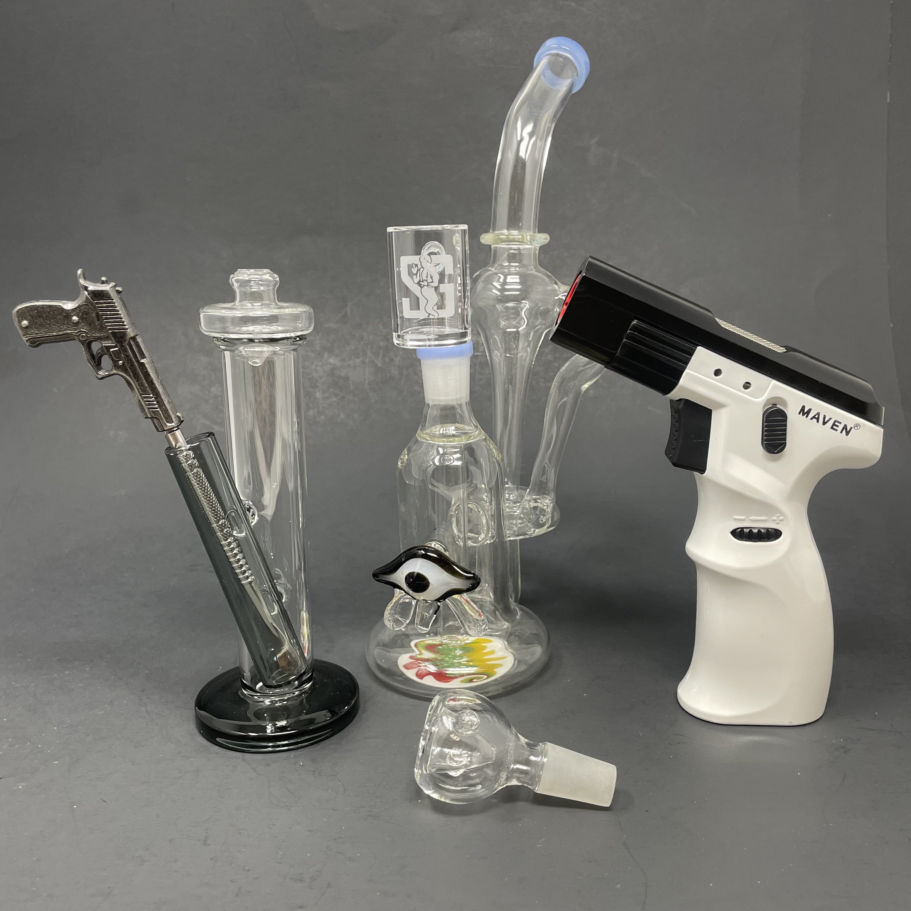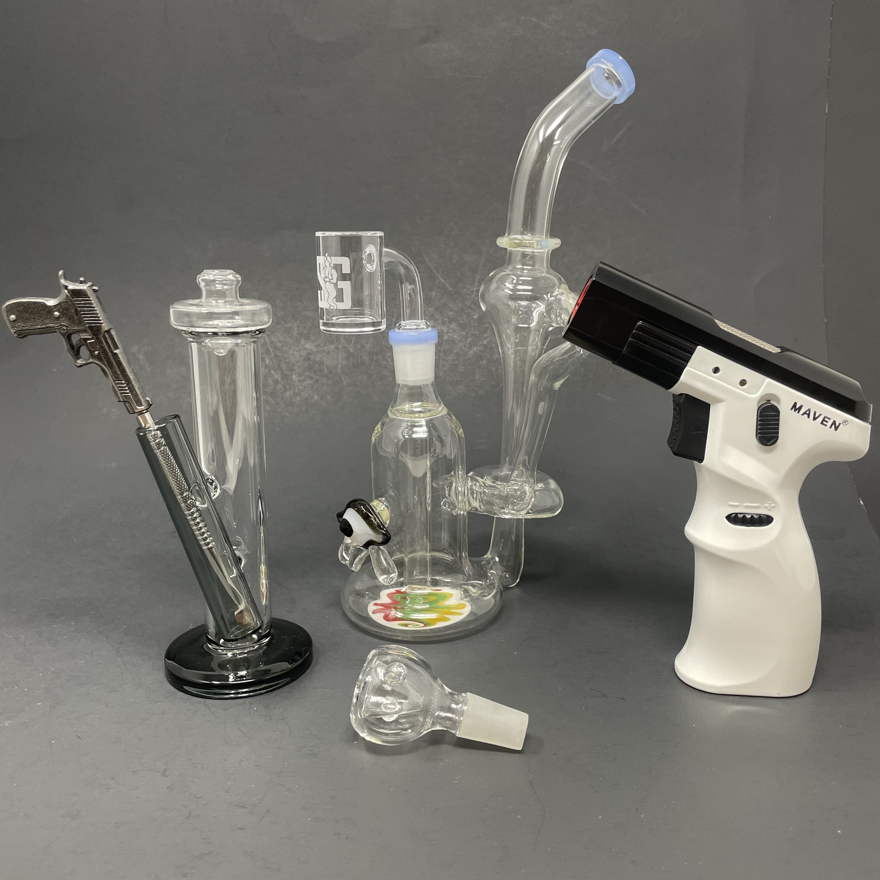 This 2nd amendment Combo features everything you need for a superior dabbing experience. The eye recycler bong ensures smooth hits while the Maven Model K Dab Torch provides powerful and precise heating. The clear carb cap, dab stand, and gun metal dab tool make this a versatile set for all your dabbing needs. Complete it with the SG Premium Bucket Banger for the ultimate dab setup.