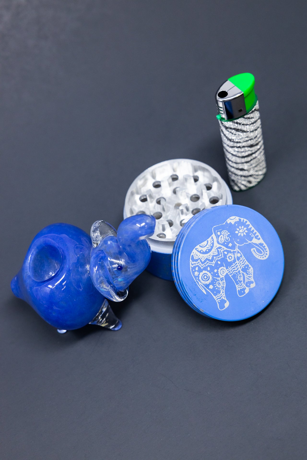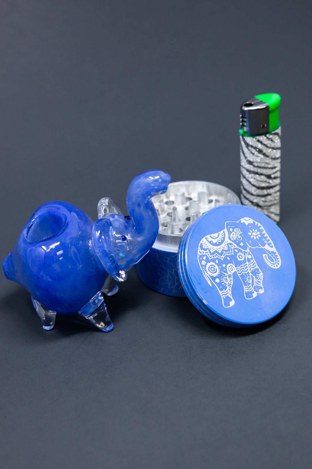 This bundle includes a animal design lighter, a 63mm sharp tooth blue elephant grinder, and a 3-inch purple elephant pipe!