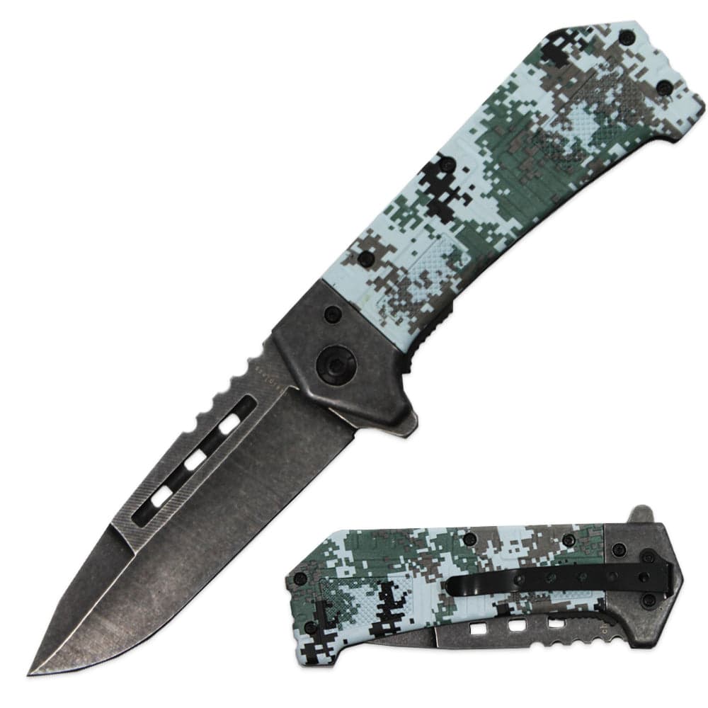 The Camouflage Handle Folding Knife combines rugged functionality with a tactical design. Its durable stainless steel blade and digital camouflage handle offer reliability and style. Featuring a spring-assisted mechanism and a convenient belt clip, this knife is perfect for outdoor adventures, camping, and everyday use.