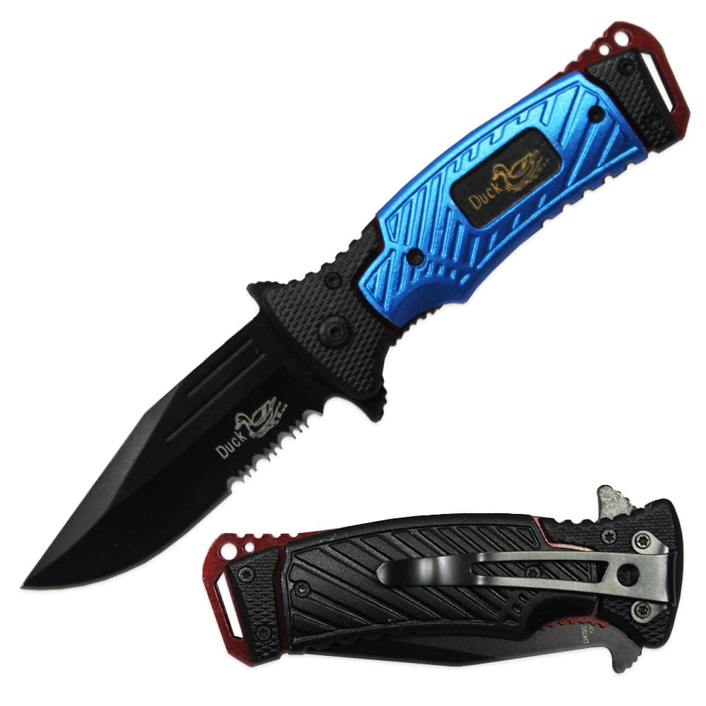 The Duck USA Blue Assist-Open Tactical Folding Knife is a stylish and functional tool built for reliability. With a sharp black stainless steel blade and a sleek blue and black ergonomic handle, this knife is perfect for outdoor enthusiasts and daily users.