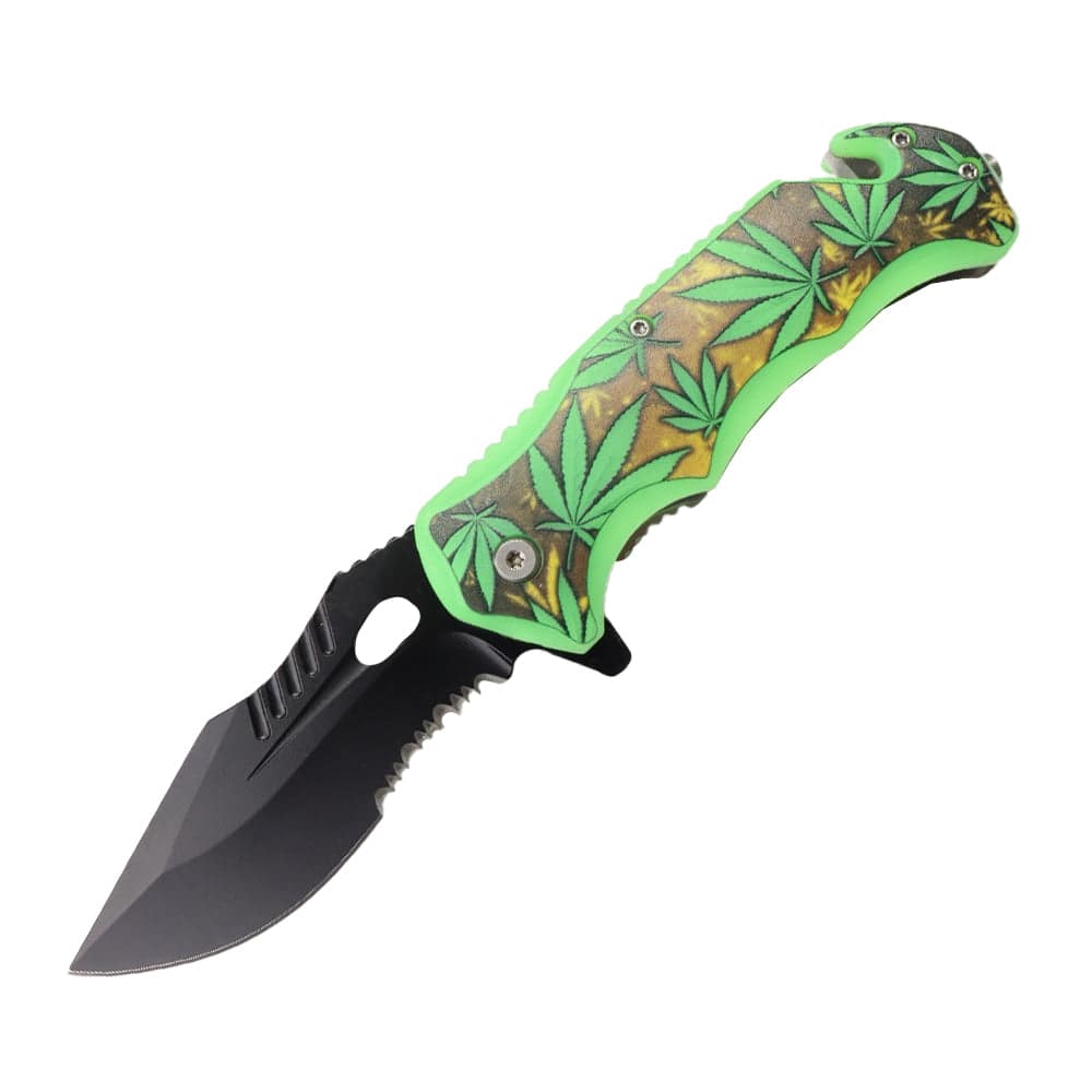 Discover the 4.5" Glow-in-the-Dark Marijuana Leafs Folding Knife—a versatile tool featuring a sharp assist-open blade, belt cutter, and glass breaker. Designed for convenience and safety, this eye-catching knife is perfect for everyday carry.
