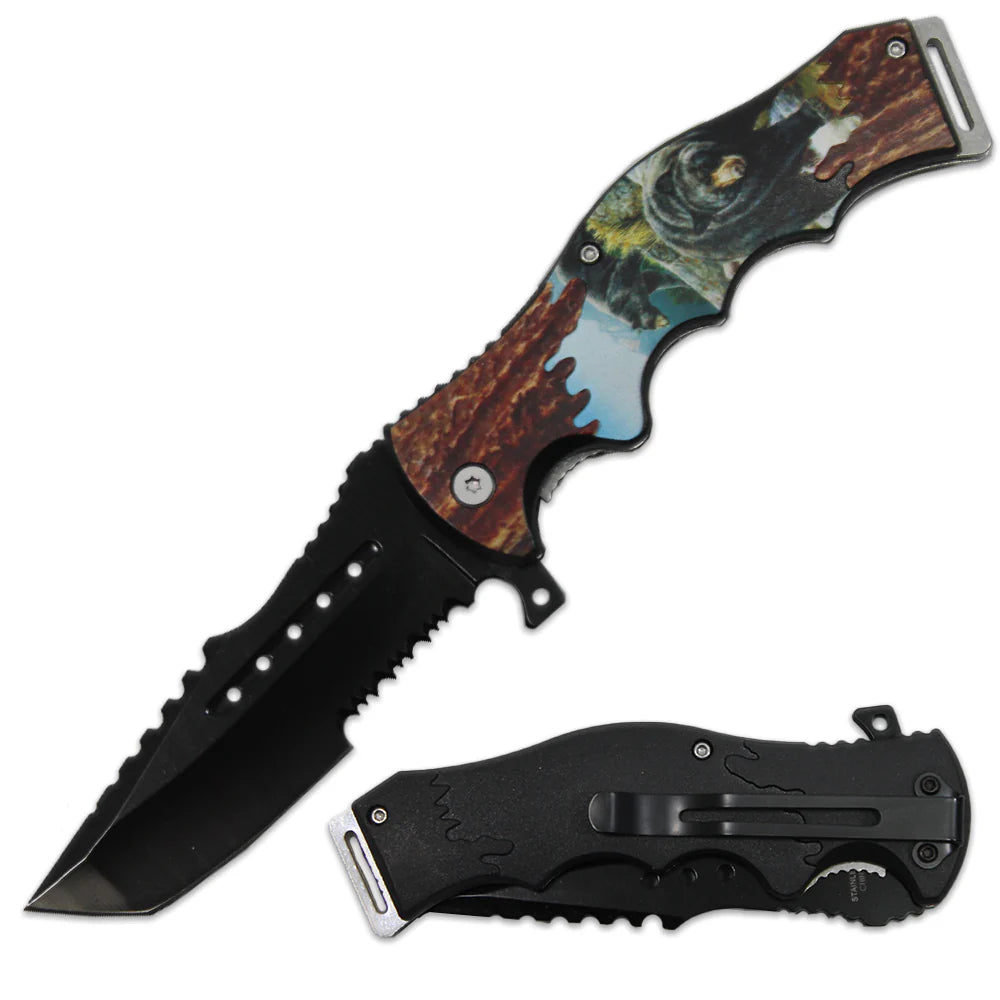 Experience the perfect blend of utility and artistry with the 4.5" Wood Wild Life Bear Folding Knife. Featuring assist-open technology and a beautifully engraved bear design, this folding knife is built for durability and style, making it a must-have for outdoor enthusiasts and collectors.