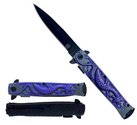 Discover the 4.5" Purple Embossed Dragon Assist-Open Folding Pocket Knife, combining sleek design with reliable performance. Perfect for collectors or everyday use, this durable knife features a striking dragon motif and smooth assisted opening.