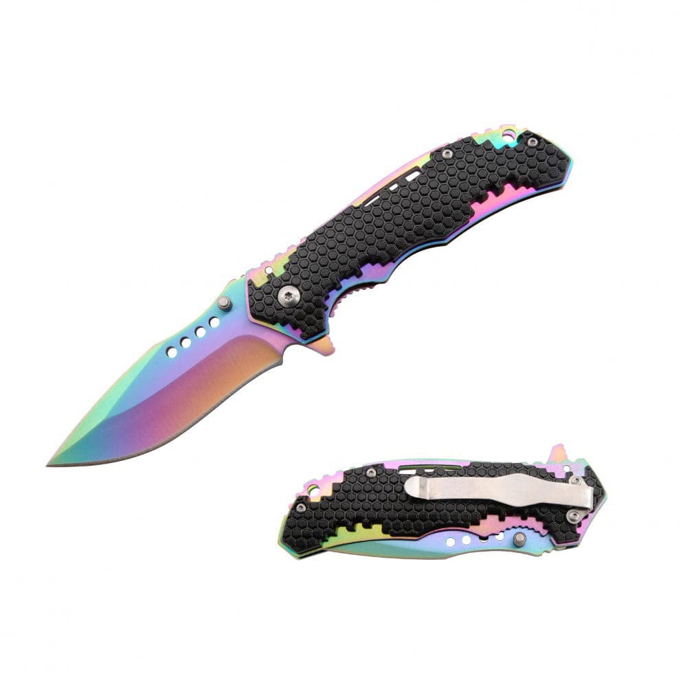 The Rainbow Honeycomb Folding Knife combines eye-catching aesthetics with everyday practicality. Its rainbow titanium-coated stainless steel blade is paired with a textured honeycomb handle for a secure grip. Featuring spring-assisted opening and a belt clip, this knife is perfect for outdoor enthusiasts, collectors, or anyone seeking a stylish, functional tool.