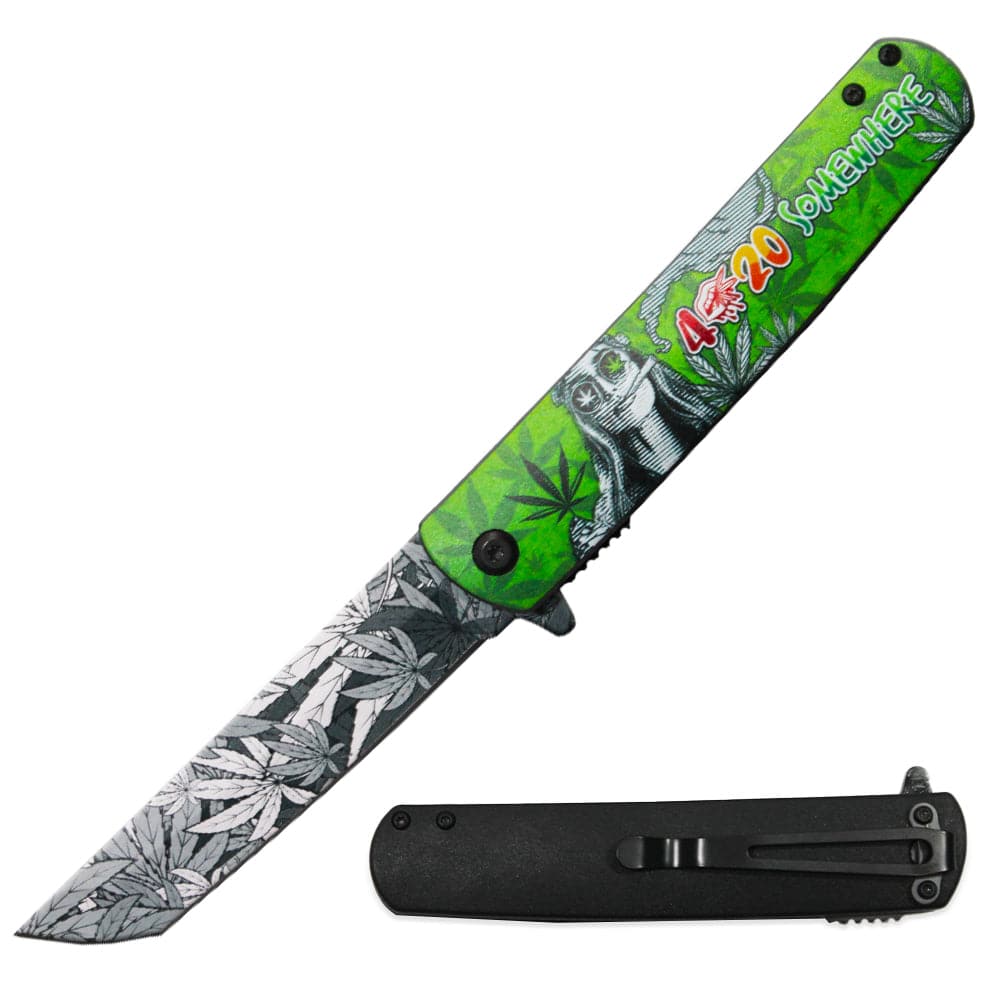 Discover the 4.5" Tanto Blade Assist-Open Pocket Knife with a durable cannabis-themed metal handle. Designed for efficiency and style, this compact knife features a sharp tanto blade and smooth assist-open mechanism, perfect for everyday carry.