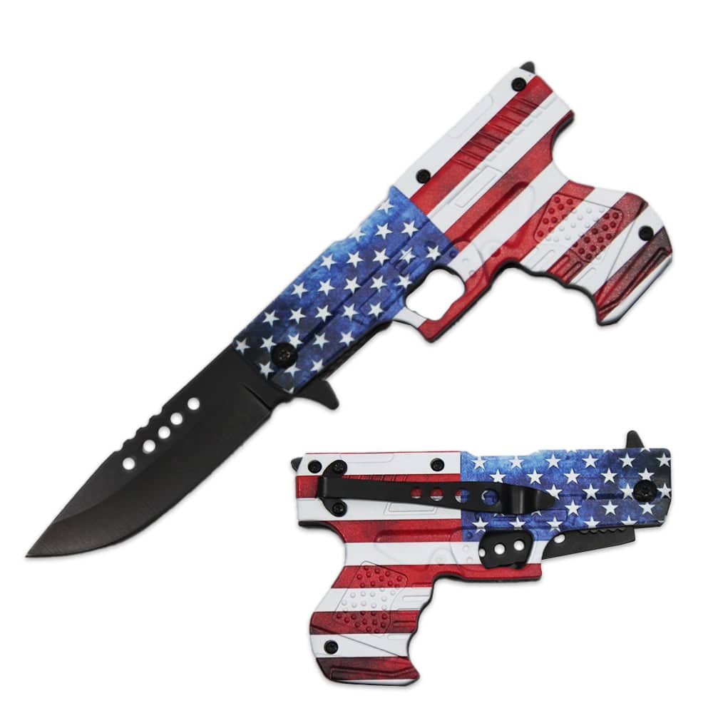 Show off your patriotic pride with this unique 4.5" folding knife featuring a gun-shaped handle adorned with a bold USA flag design. The spring-assisted blade ensures quick deployment, and the ergonomic handle offers a comfortable grip. Ideal for everyday carry, outdoor activities, or as a collectible piece for enthusiasts.