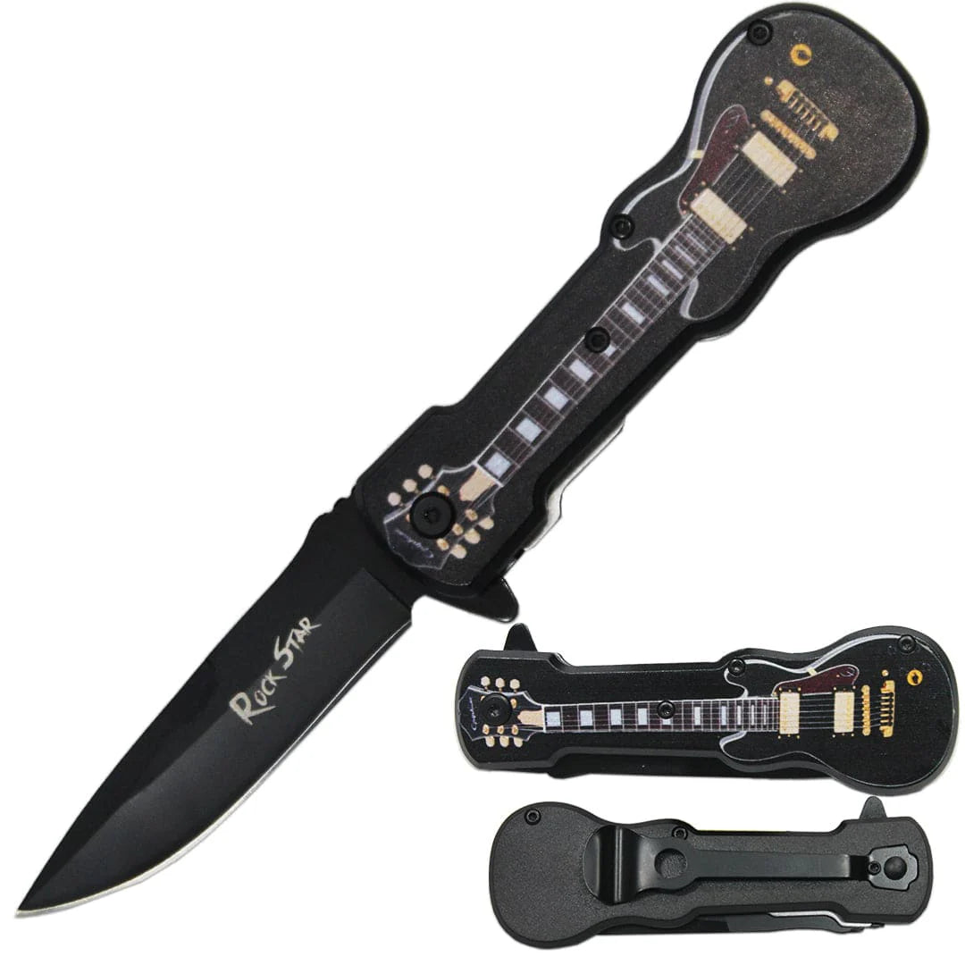 Discover the 4.75" Guitar Metal Handle Assist-Open Knife, blending style and functionality. Features a sleek guitar-shaped metal handle, reliable assist-open mechanism, and a convenient belt clip for easy carry. Perfect for everyday use or gifting.