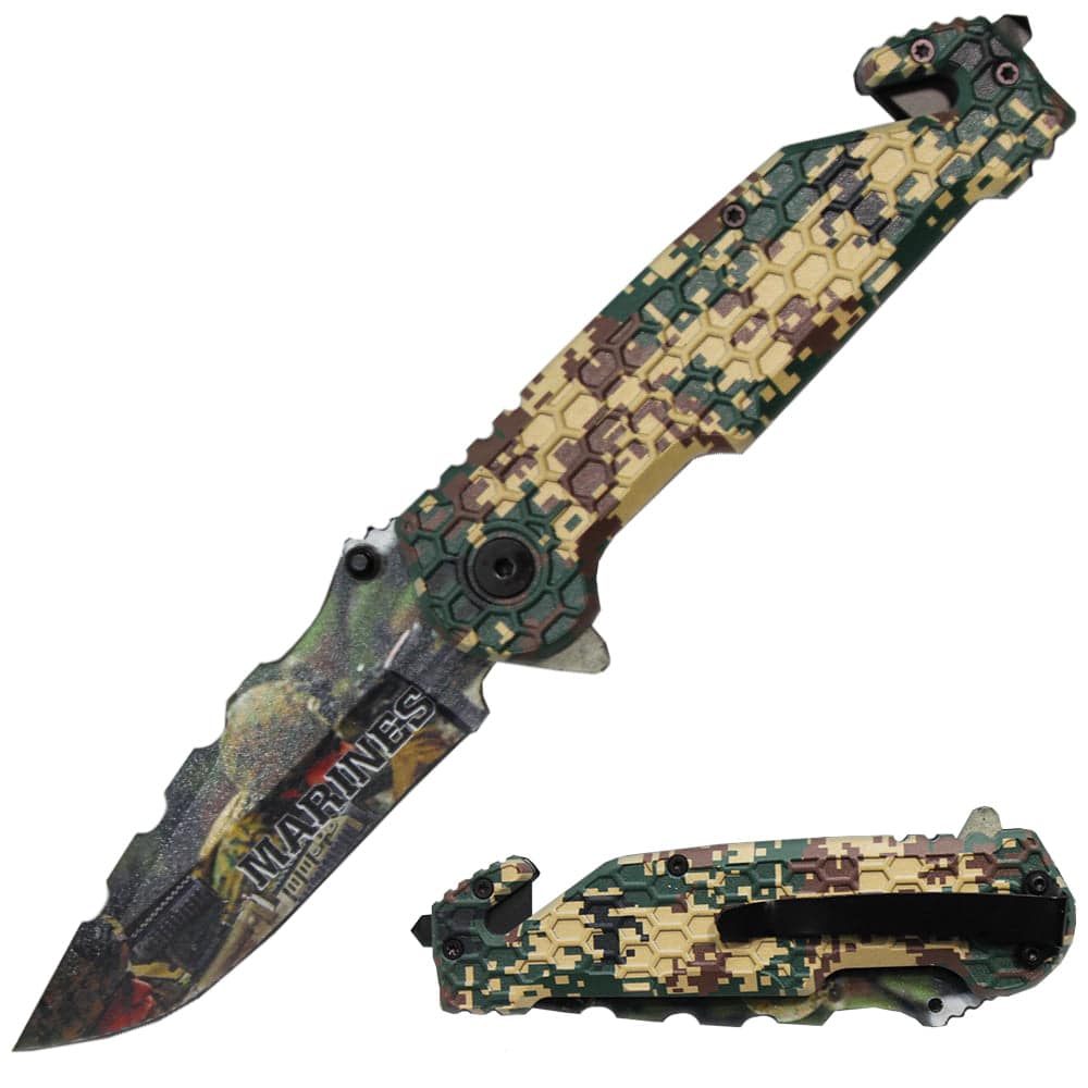 Here is our new" 4.75” Serviceman Camo Honeycomb Handle Tactical Rescue Knife—precision-engineered for durability and versatility. Ideal for outdoor enthusiasts and emergencies, this knife combines a sharp blade with a robust camo honeycomb handle for superior grip and style.