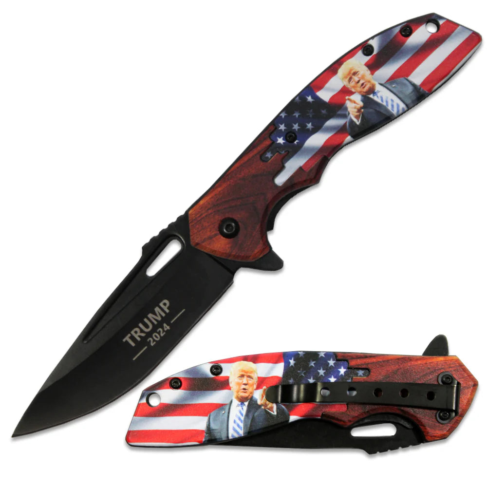 Show your patriotic pride with the 4.75" Trump USA Flag Folding Knife. Featuring a sharp stainless steel blade, assist-open mechanism, and a durable belt clip, this knife offers style and reliability for everyday carry. Perfect for collectors and practical use alike.