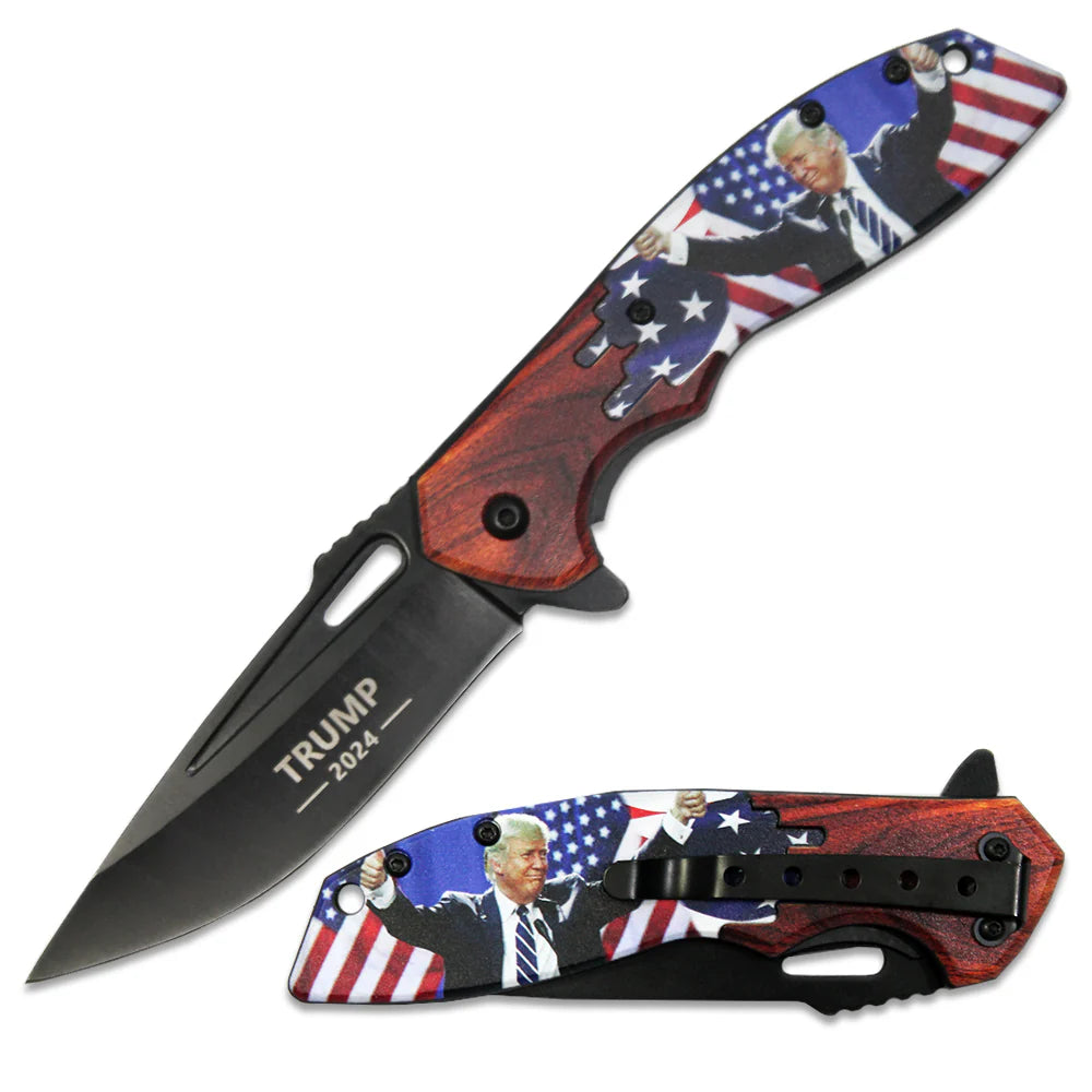 Show your patriotic pride with the 4.75" Trump USA Flag Folding Knife. Featuring a sharp stainless steel blade, assist-open mechanism, and a durable belt clip, this knife offers style and reliability for everyday carry. Perfect for collectors and practical use alike.