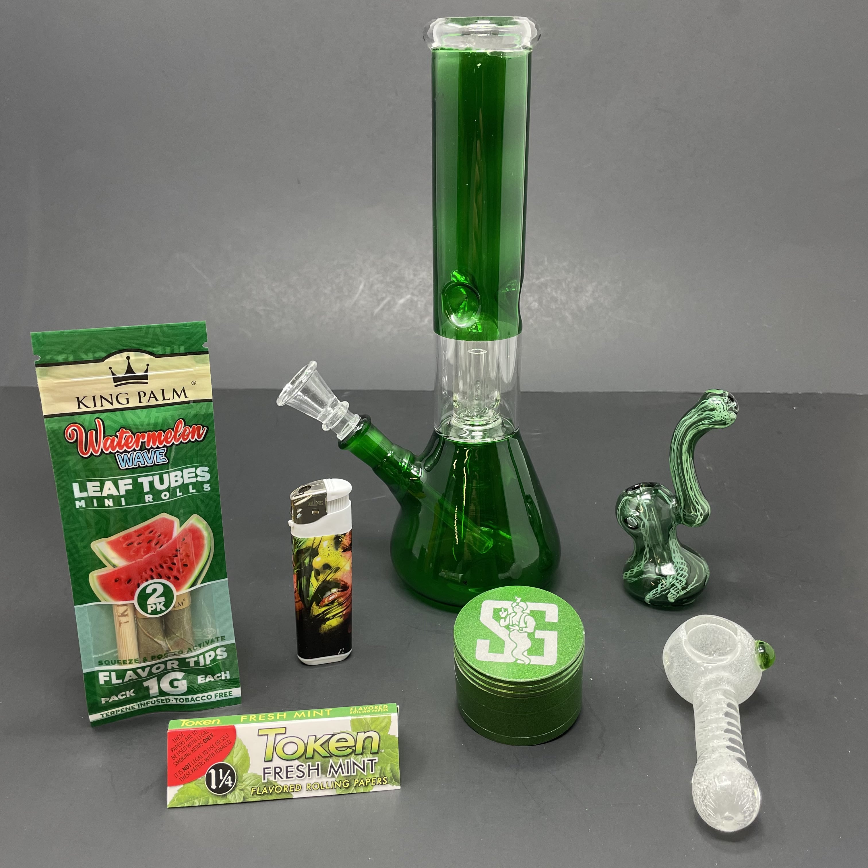Discover endless ways to elevate your smoking experience with the 420 Combo! This incredible set includes a 10" Green Single Perc Bong, 5" Green Glass Bubbler, Stoned Genie Grinder for perfectly ground herbs, a Spiral Glow in the dark pipe for added style, a refreshing Watermelon King Palm for smooth hits, a mystery lighter to keep the good times going, and mint token paper for a clean burn. Don't just smoke, indulge!