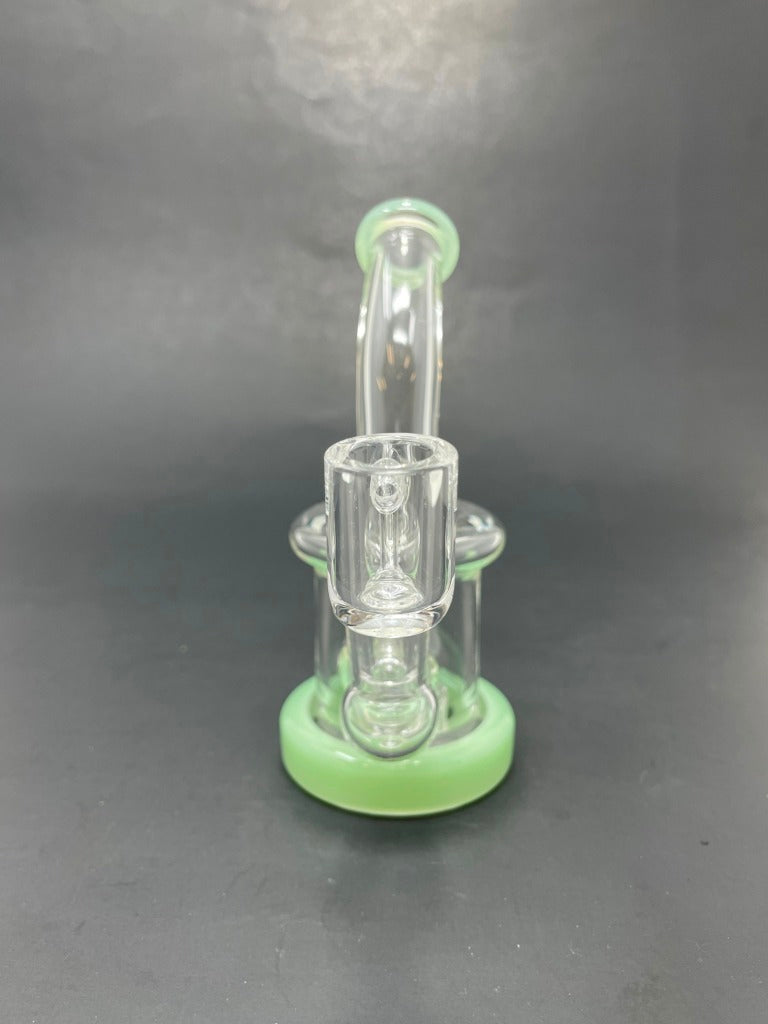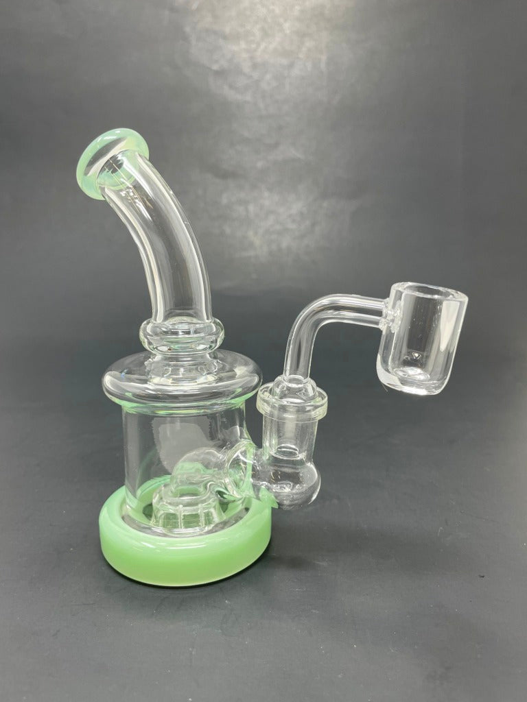 The 5.5" Mini Shower Bend Dab Rig in Milky Green is made from sturdy borosilicate glass, ensuring durability and purity in your sessions. Its single percolator delivers smooth, filtered hits for a cleaner experience. Available in an elegant milky green shade, it combines style with function. The 14mm banger offers easy use and seamless compatibility, making this rig a reliable choice for your dabbing needs.