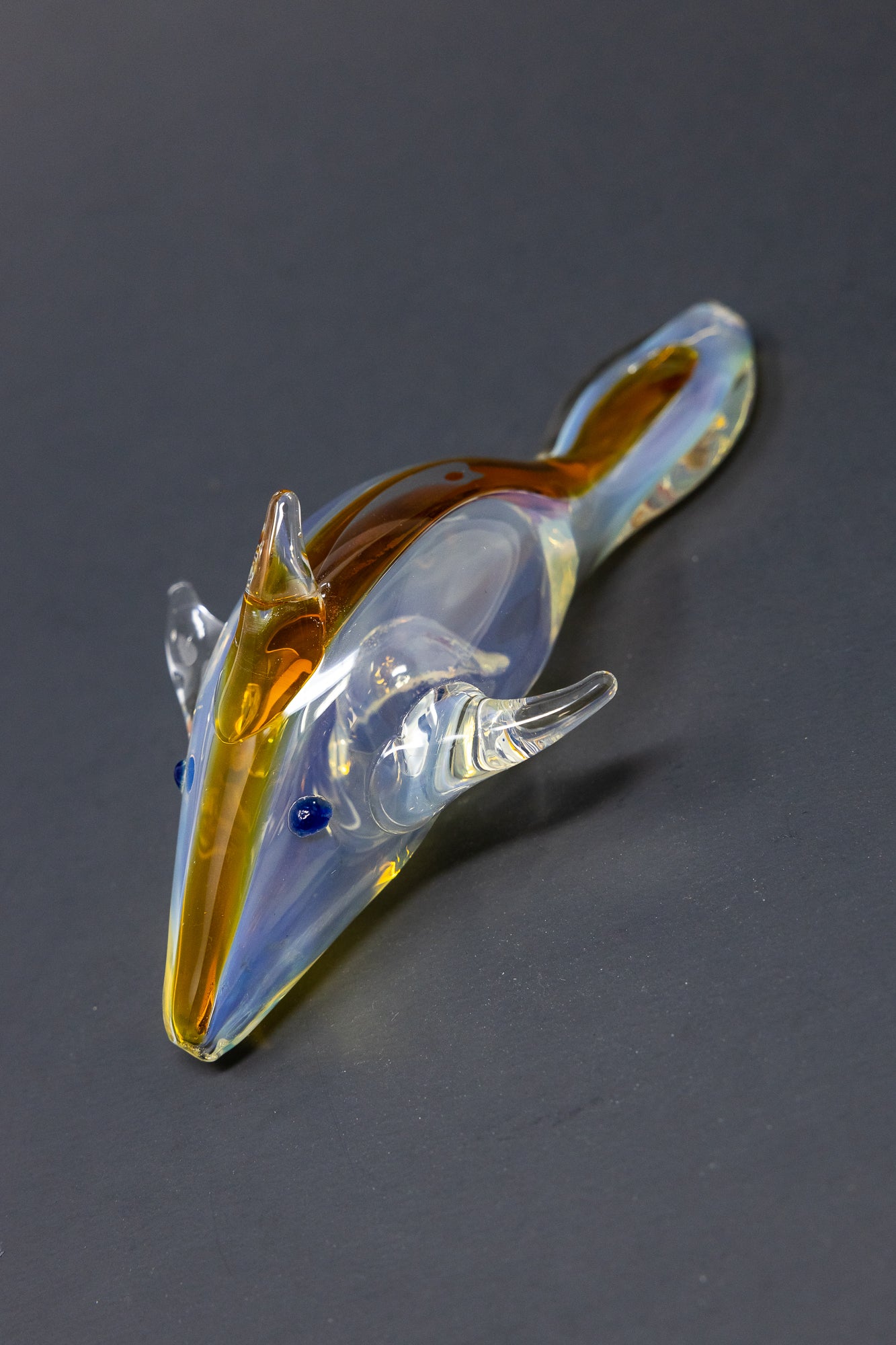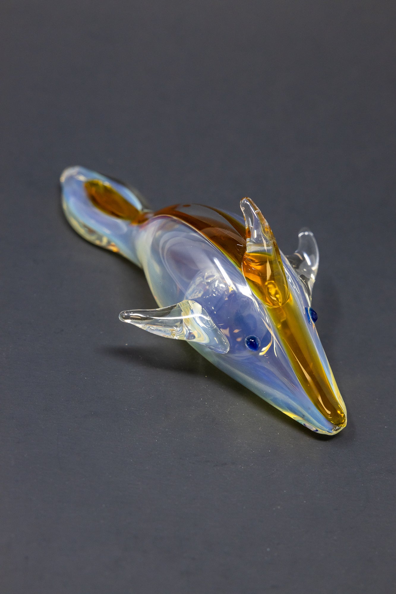 Are you looking for a unique handmade glass bowl piece? This dolphin hand pipe will blow your mind. The bowl is loaded on the belly and the mouth piece is at the end of the tail. You won't regret adding this unique glass pipe to your collection.