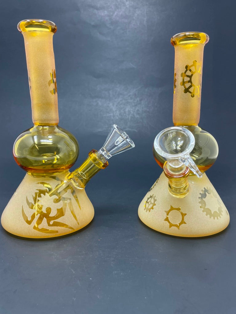 Experience smooth sessions with our 7" Assorted Design Bongs in gold, featuring a sand-blasted bubble splash guard for cleaner hits. Crafted from durable borosilicate glass, each bong includes a 14mm bowl and built-in stem, ensuring reliable performance. Available in different colors to suit your style, these bongs combine functionality with eye-catching design.
