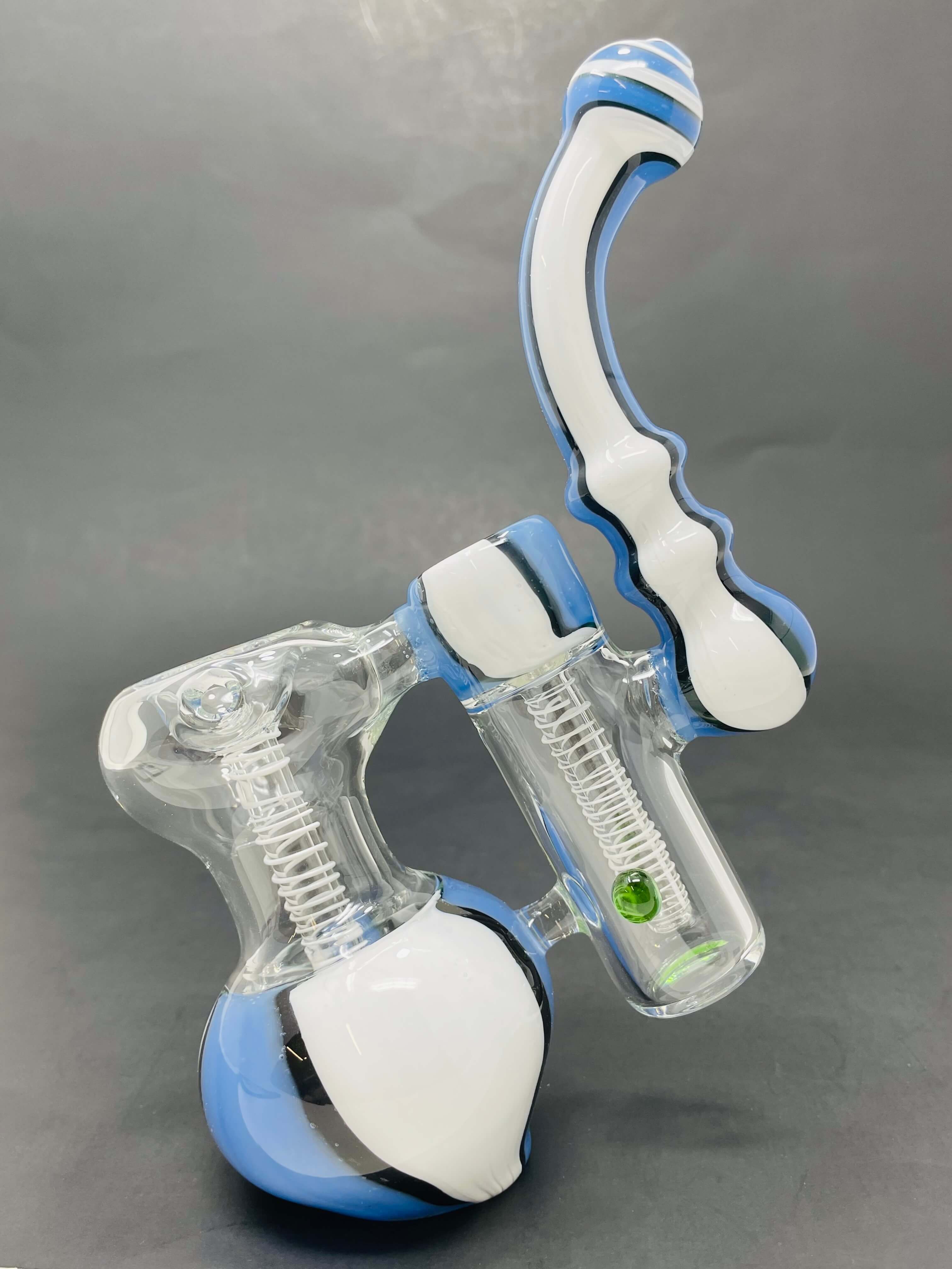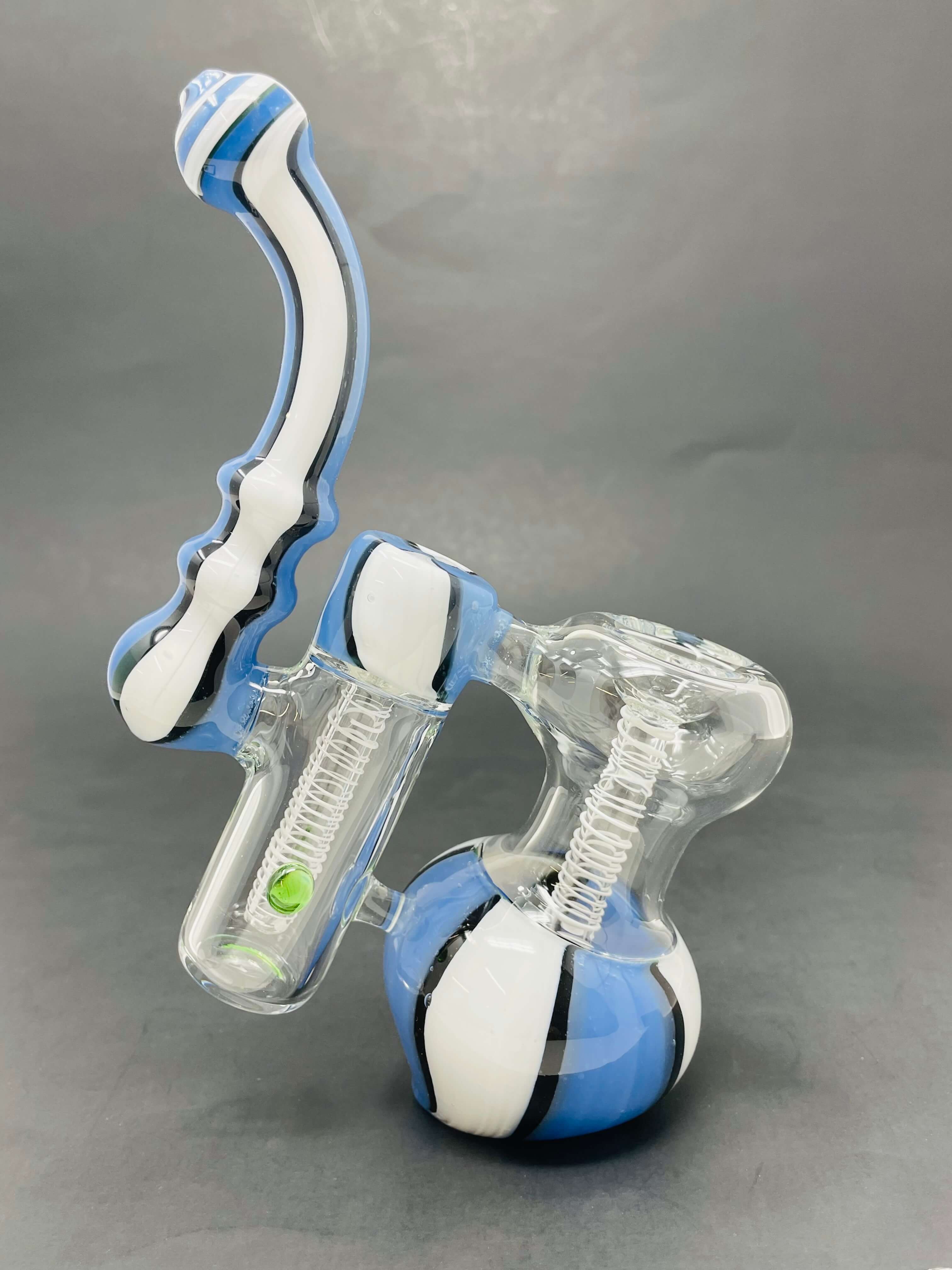 Experience a smoking experience like no other with our 7" Blue/White Double Chamber Bubbler. Made of premium thick glass, this bubbler fits comfortably in your hand and features a carb hole for smooth draws. Add this premium bubbler to your collection and elevate your smoking game!