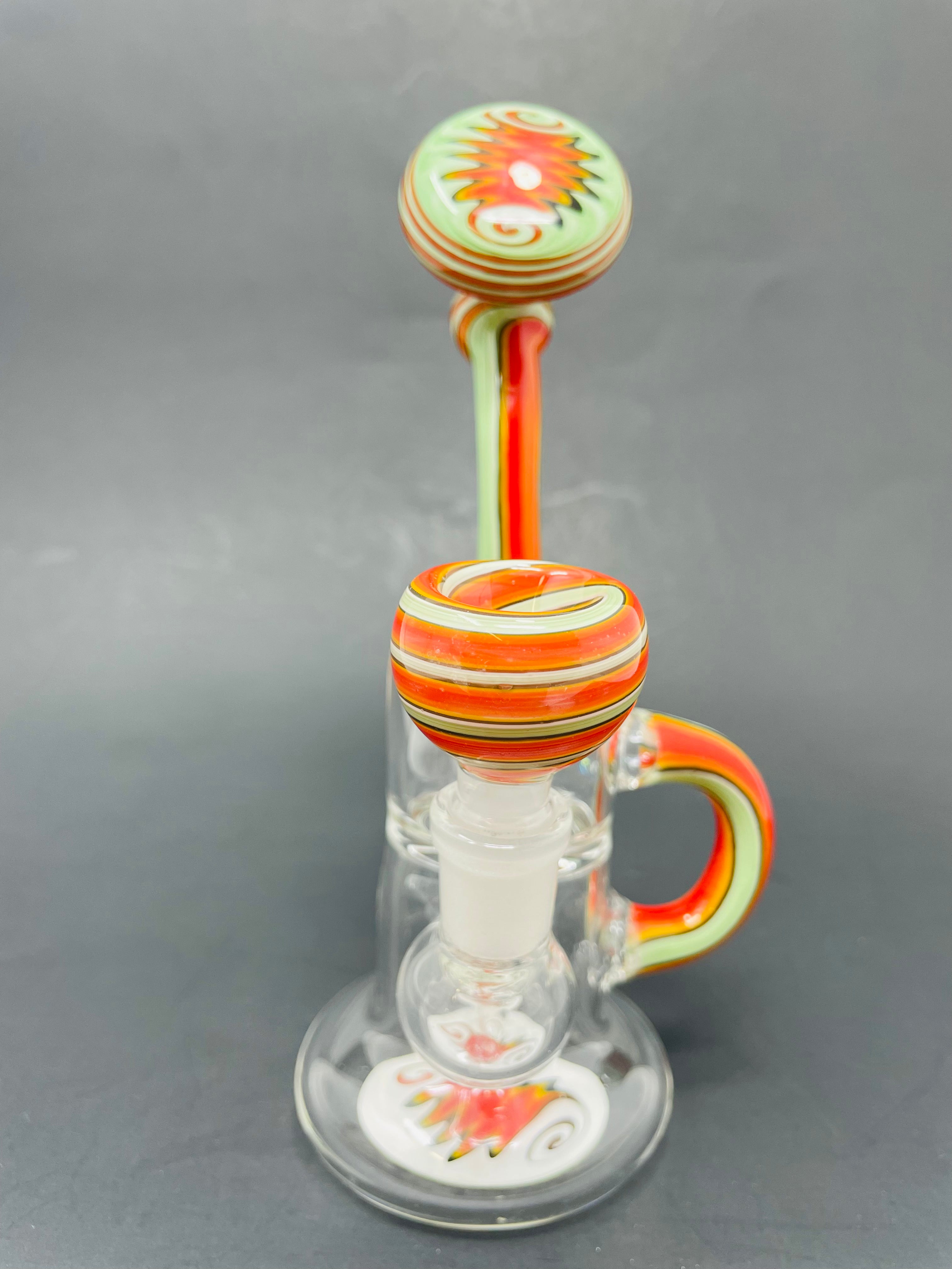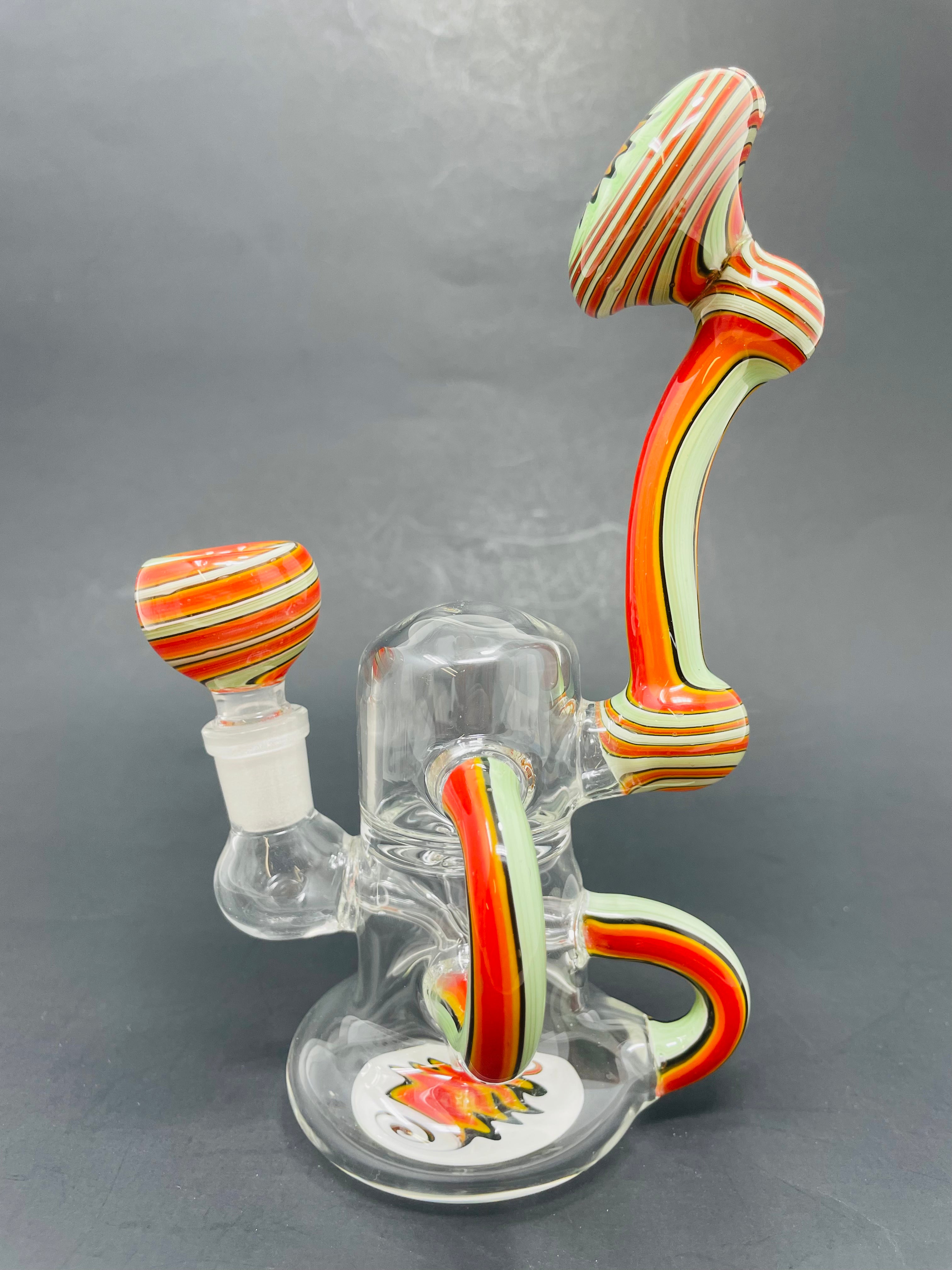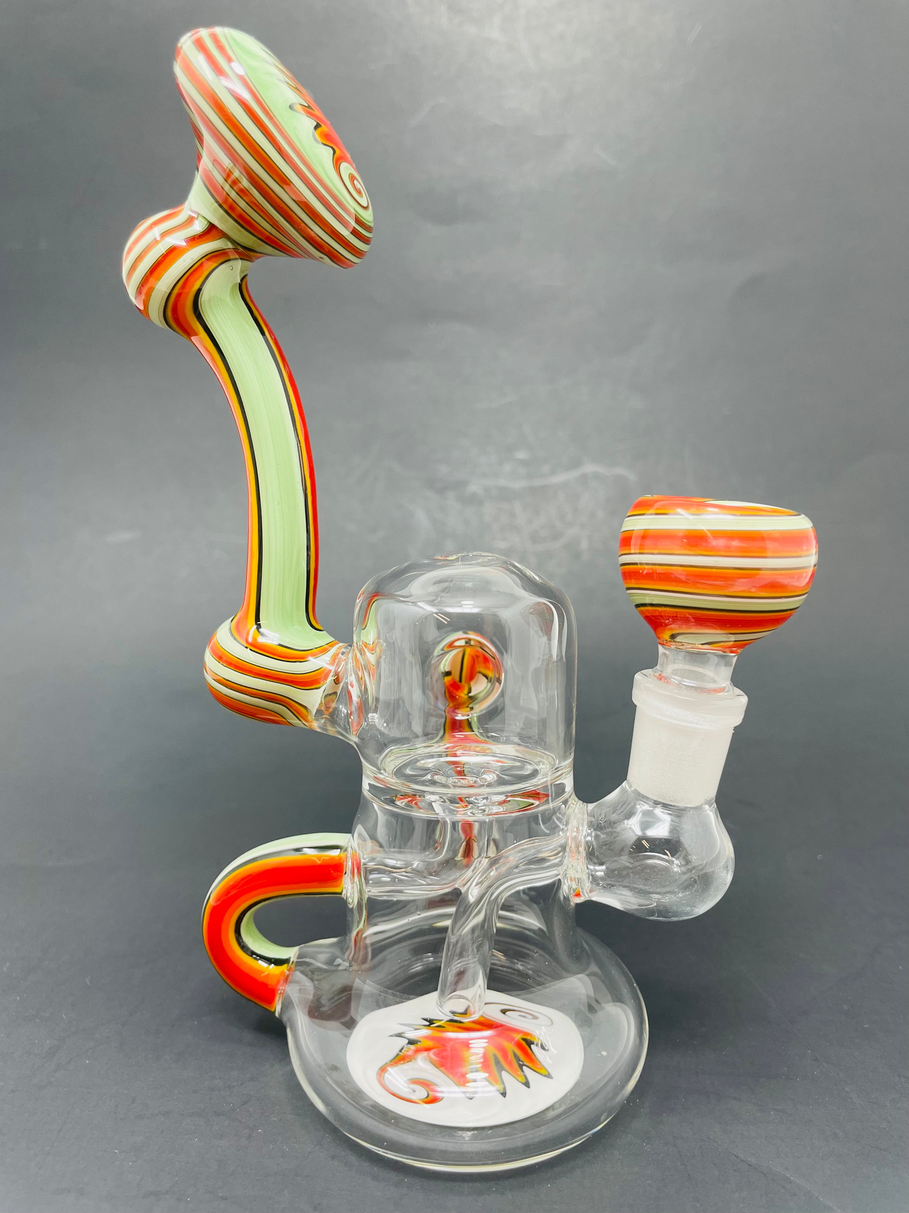 Enhance your smoking experience with our hand-made, borosilicate glass 7" round recycler! Featuring a 14mm banger and a unique recycler design, you'll enjoy a smoother, cleaner hit every time. Say goodbye to harsh smoke and hello to a more enjoyable smoke session!