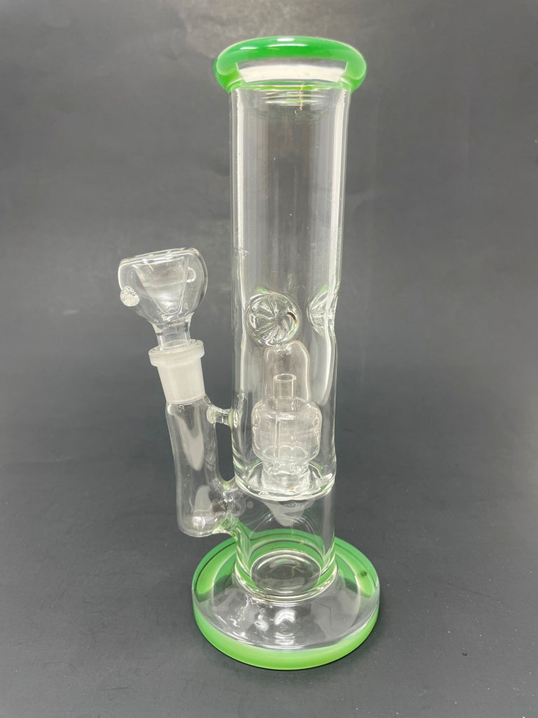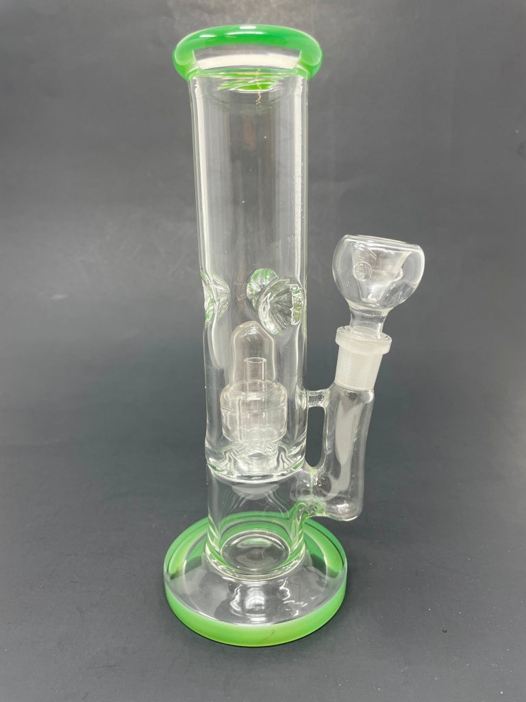 This 8" Shooter in vibrant green features a single percolator and ice catcher for smoother hits. Crafted from durable borosilicate glass with a flat base for stability, it includes a 14mm bowl. The straight design offers clean functionality while the percolator filters your smoke for a more enjoyable experience.