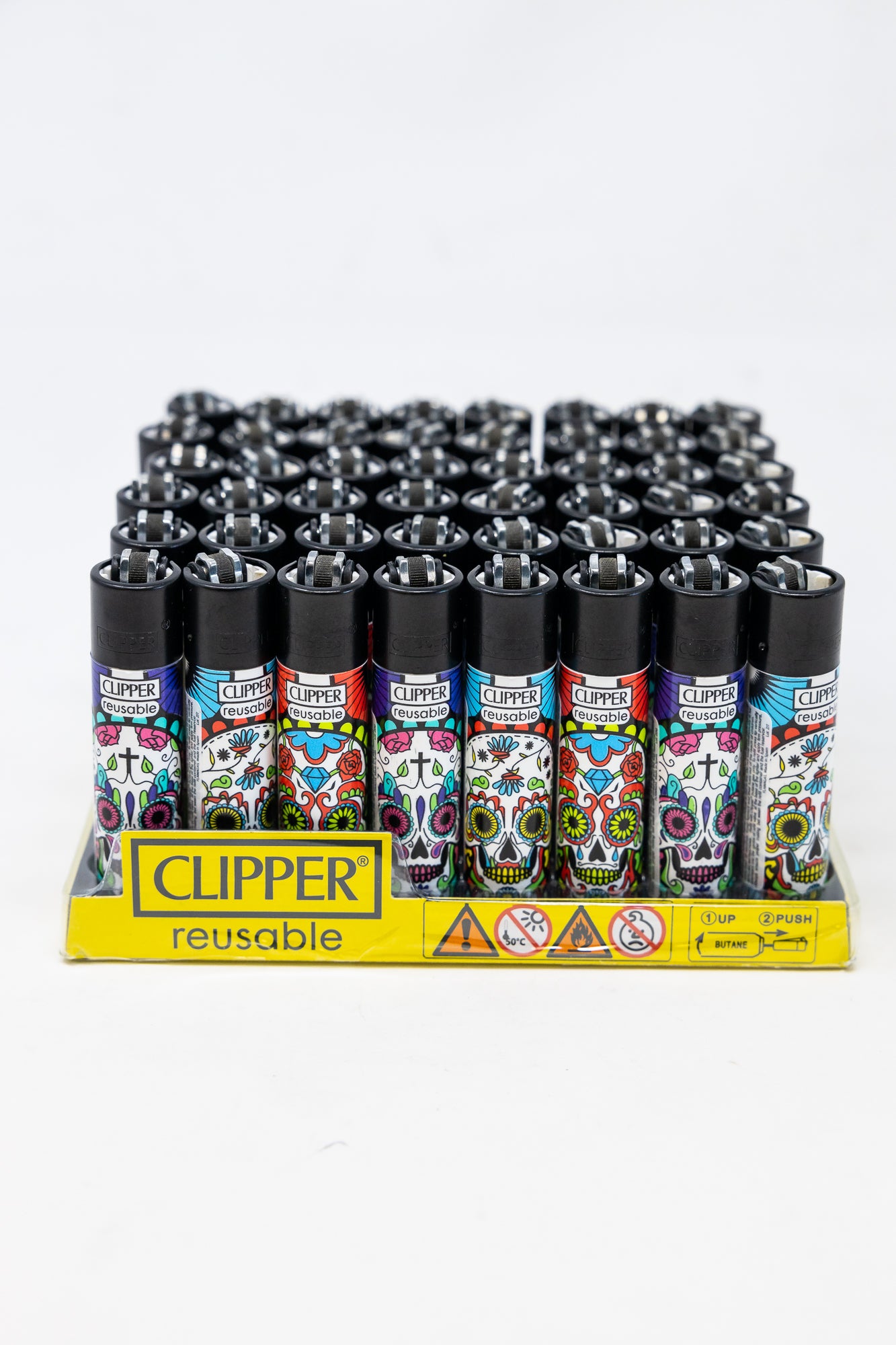 Clipper Lighter. Its durable construction, vibrant sugar skull design,