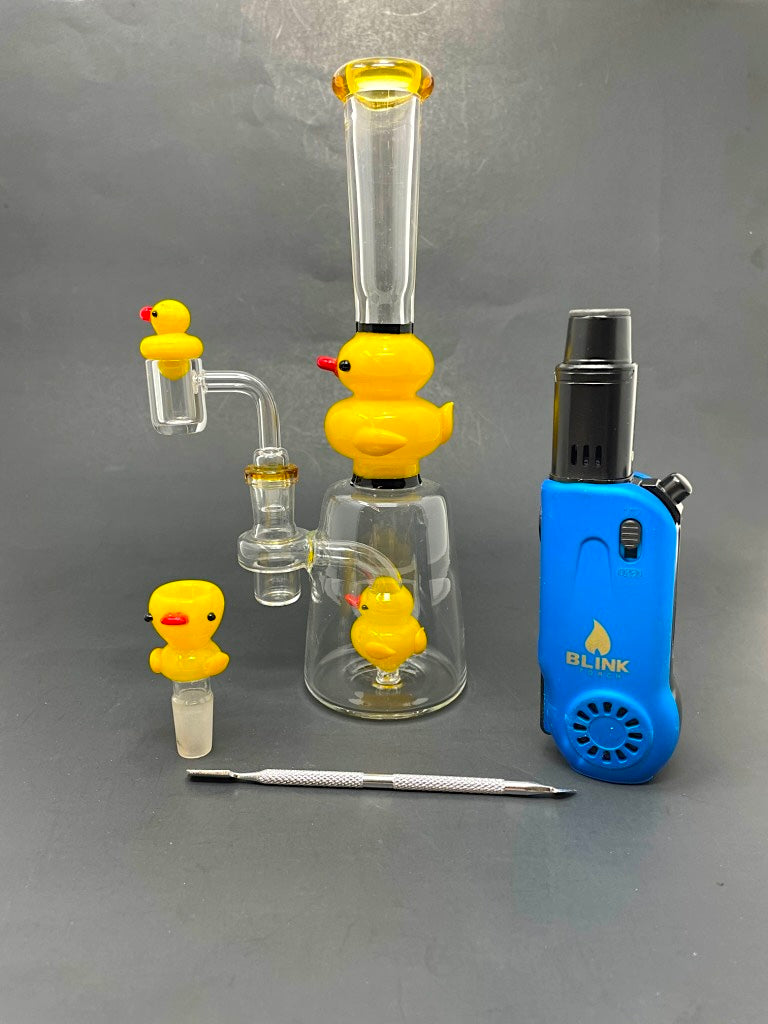 Introducing the Dirty Pond Combo - the ultimate dabbing experience. This combo includes a 9" Duck Percolator Bong for smooth hits, a Rubber Duck Glass Carb Cap for precise airflow control, a 14mm Male Quartz banger for superior heat retention, a metal Dab Tool with a scooper for easy use, and a Blink Mod Torch for quick and efficient heating. Upgrade your dab game with the Dirty Pond Combo.