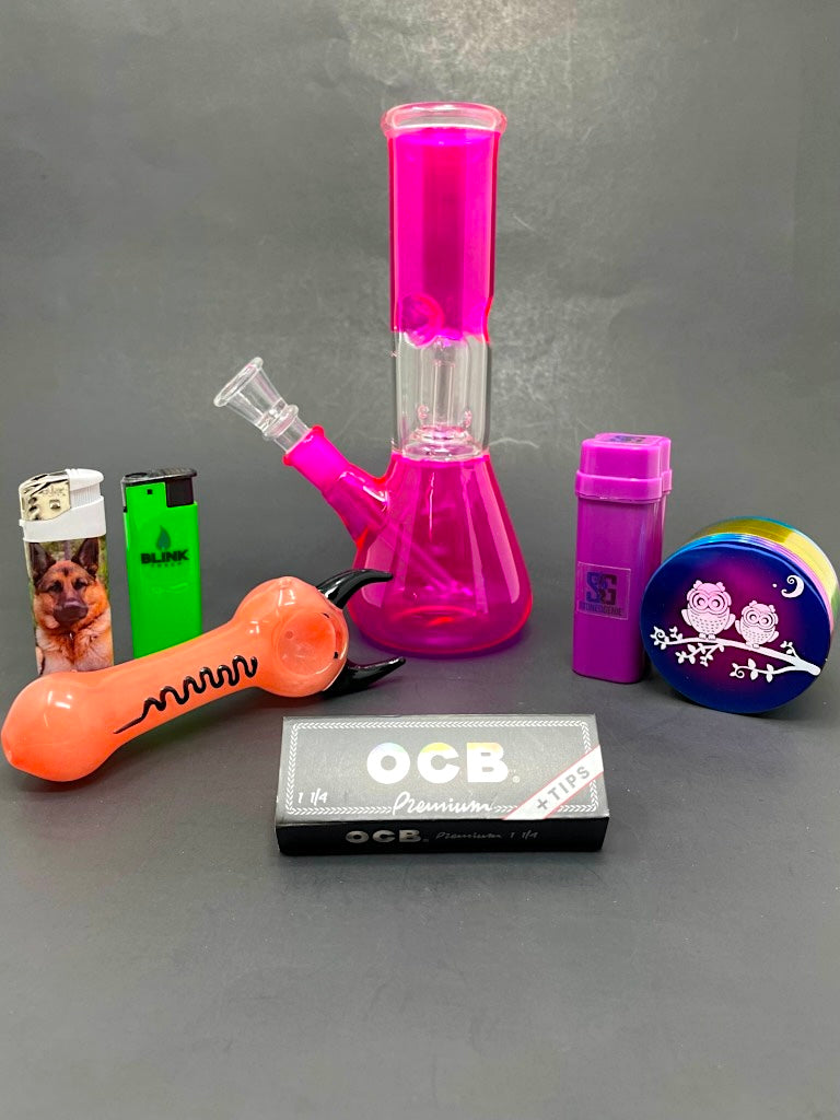 Introducing Dragons Breath, the ultimate smoking kit for those who like a little flair. With an 8" Pink Single Perk Bong that has an ice catcher, a 5" Pink Devil Hand Pipe, a double joint and lighter holder in a funky purple color, OCB Premium Rolling Papers with tips, a neon wind proof lighter, and even a dog design lighter, plus a 4 pc owl grinder with sharp teeth, this kit will take your smoking game to the next level. (Breath fire with style!)
