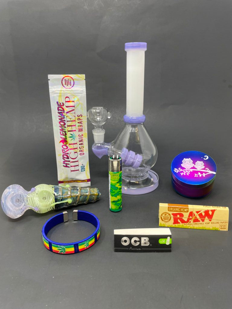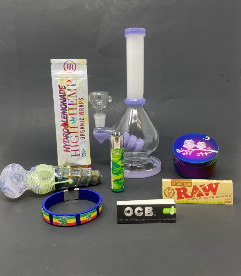 Enjoy the ultimate smoking experience with our Grape Sherbet Combo! This combo includes an 8" Purple White Neck Flat Base Bong, High Hemp Hydro Lemonade, Leaf Rasta Bracelet, Owl Grinder with sharp teeth, Organic Hemp Raw Classic rolling papers, Camo Clipper lighter with a poker, 5" Purple Double Bowl Ice Cream Glass Pipe, and OCB Flat Tip Book. Elevate your smoking game with this convenient and stylish combo!
