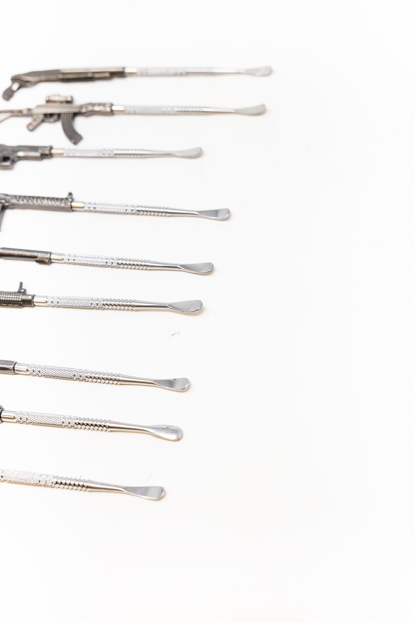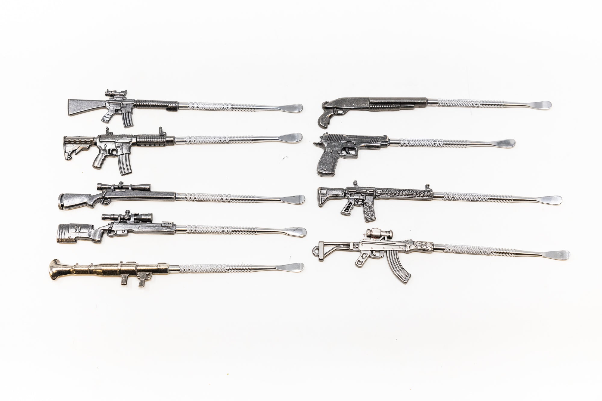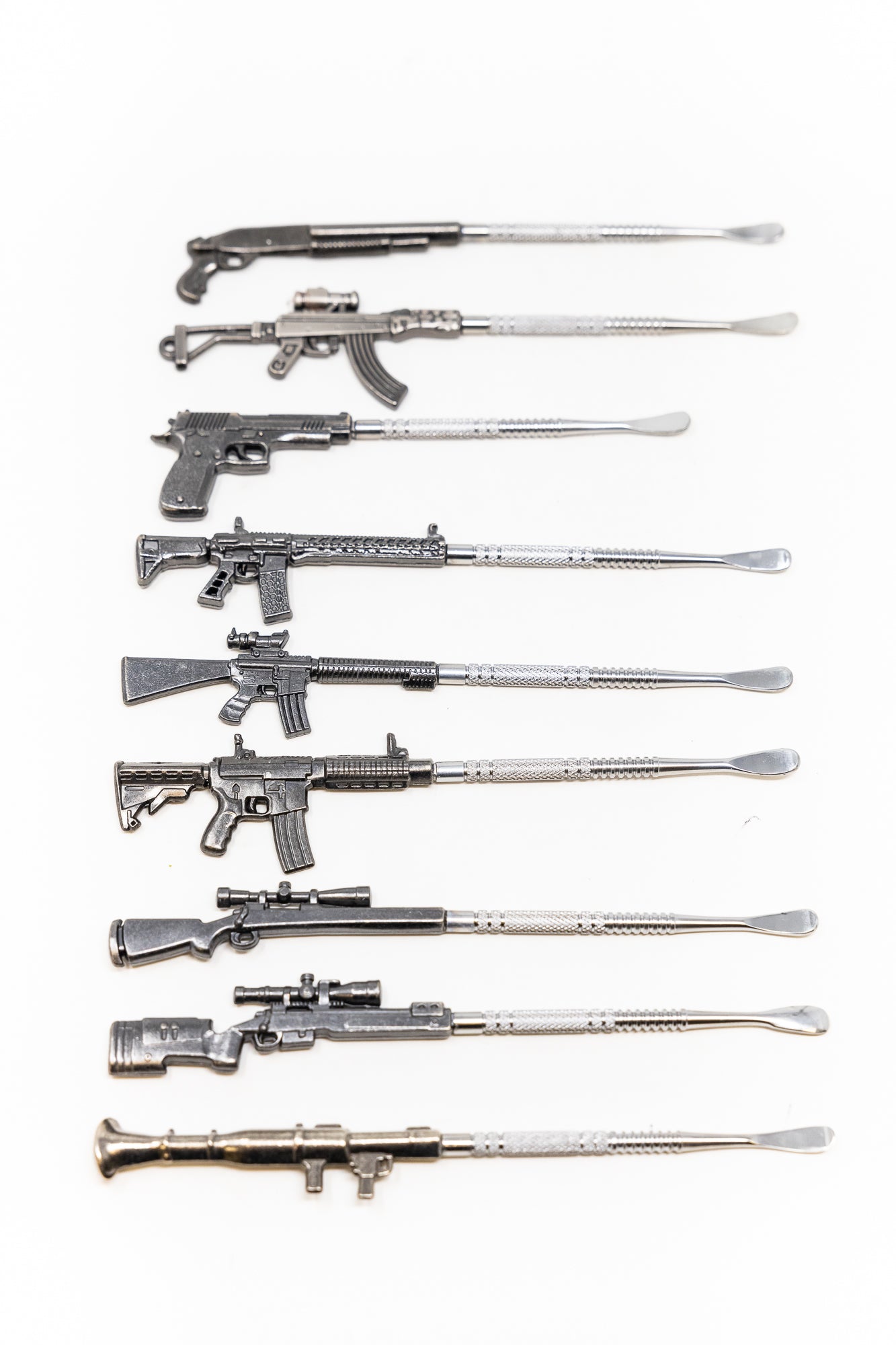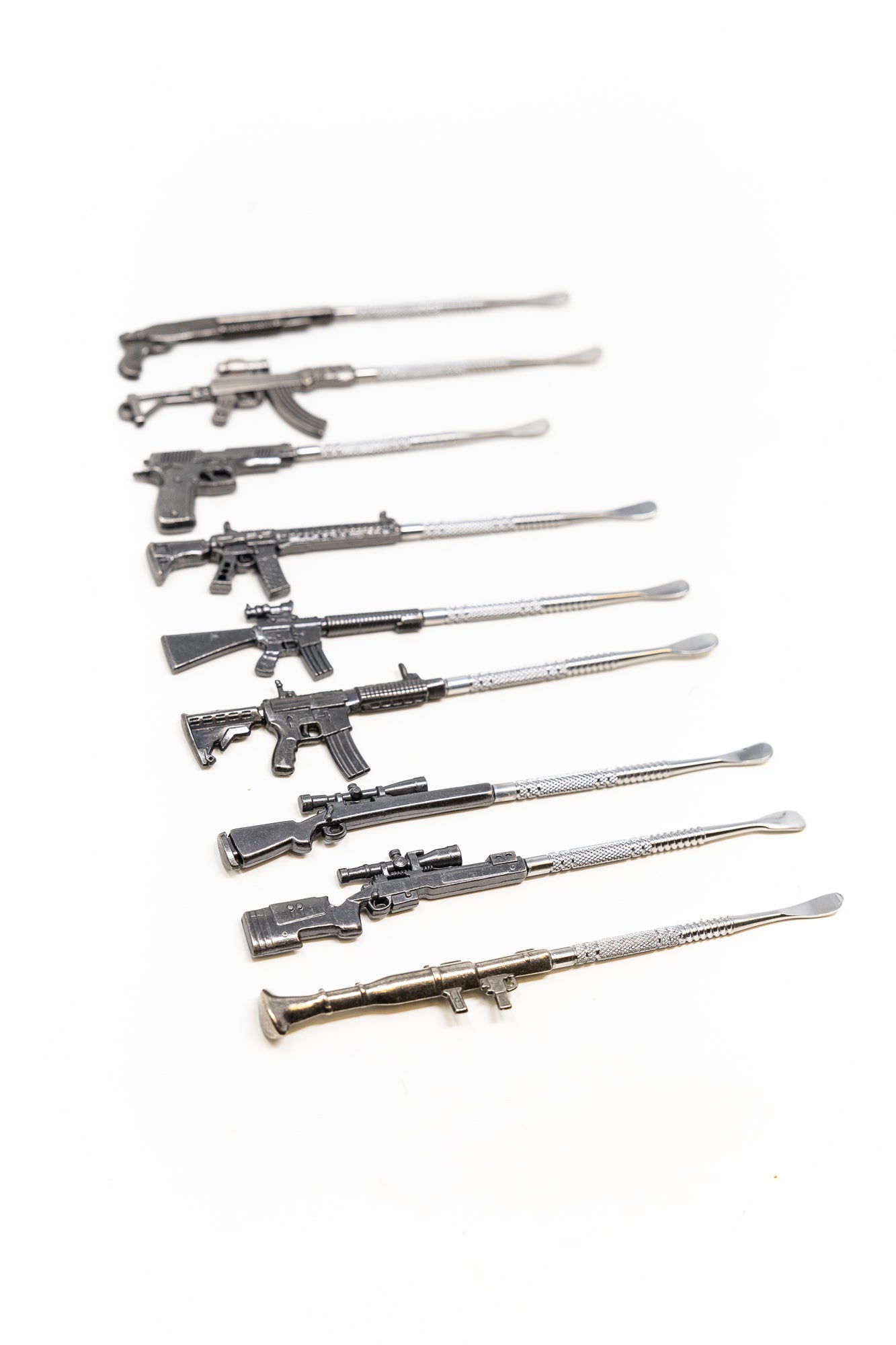 Introducing the Gun Metal Dab Tool, a sturdy and powerful gadget for all your smoking needs. Its full metal construction and gun-shaped handle with a textured grip provide excellent control and comfort. The flat spoon end is perfect for handling concentrates with precision. Get ready to enhance your smoking experience and live life with abandon by grabbing your Gun Metal Dab Tool today!