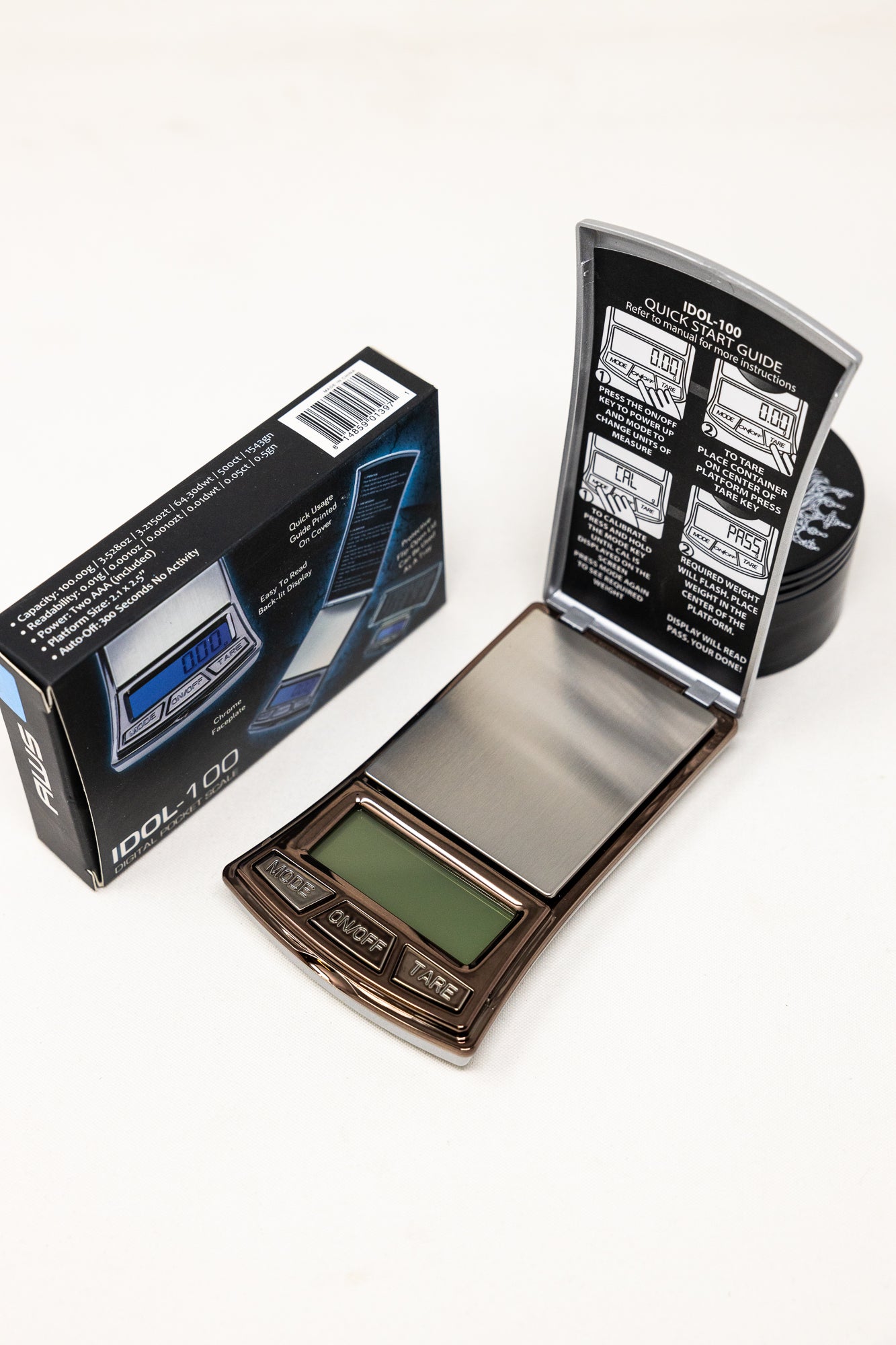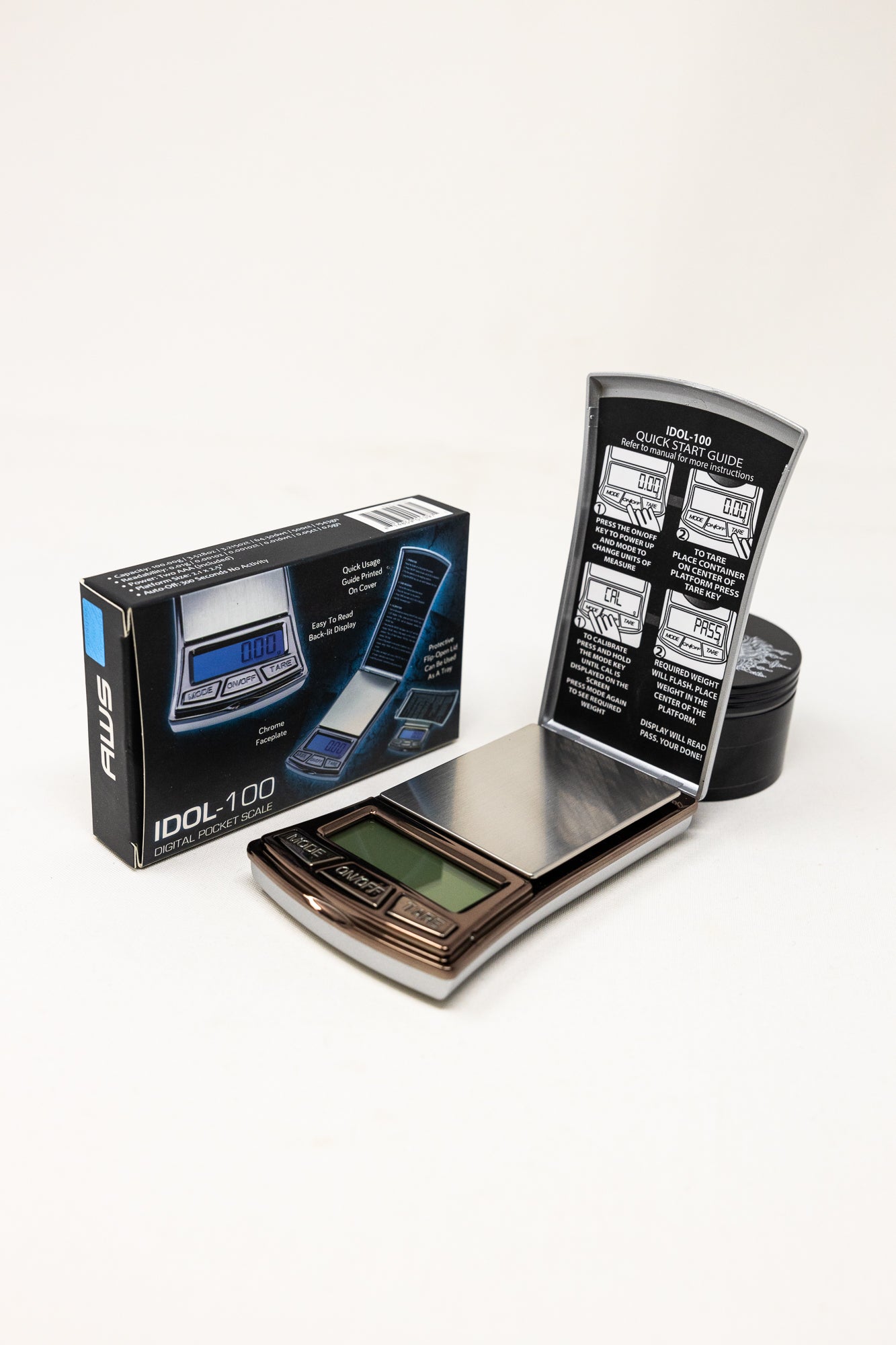 Meet your new go-to for precise measurements on the go! The IDOL-100 Digital Scale Pocket Scale features a chrome faceplate and an easy-to-read backlit display. Its protective flip-open lid doubles as a tray, and the quick usage guide printed on the cover makes it a breeze to use. Compact, convenient, and accurate - perfect for all your weighing needs.