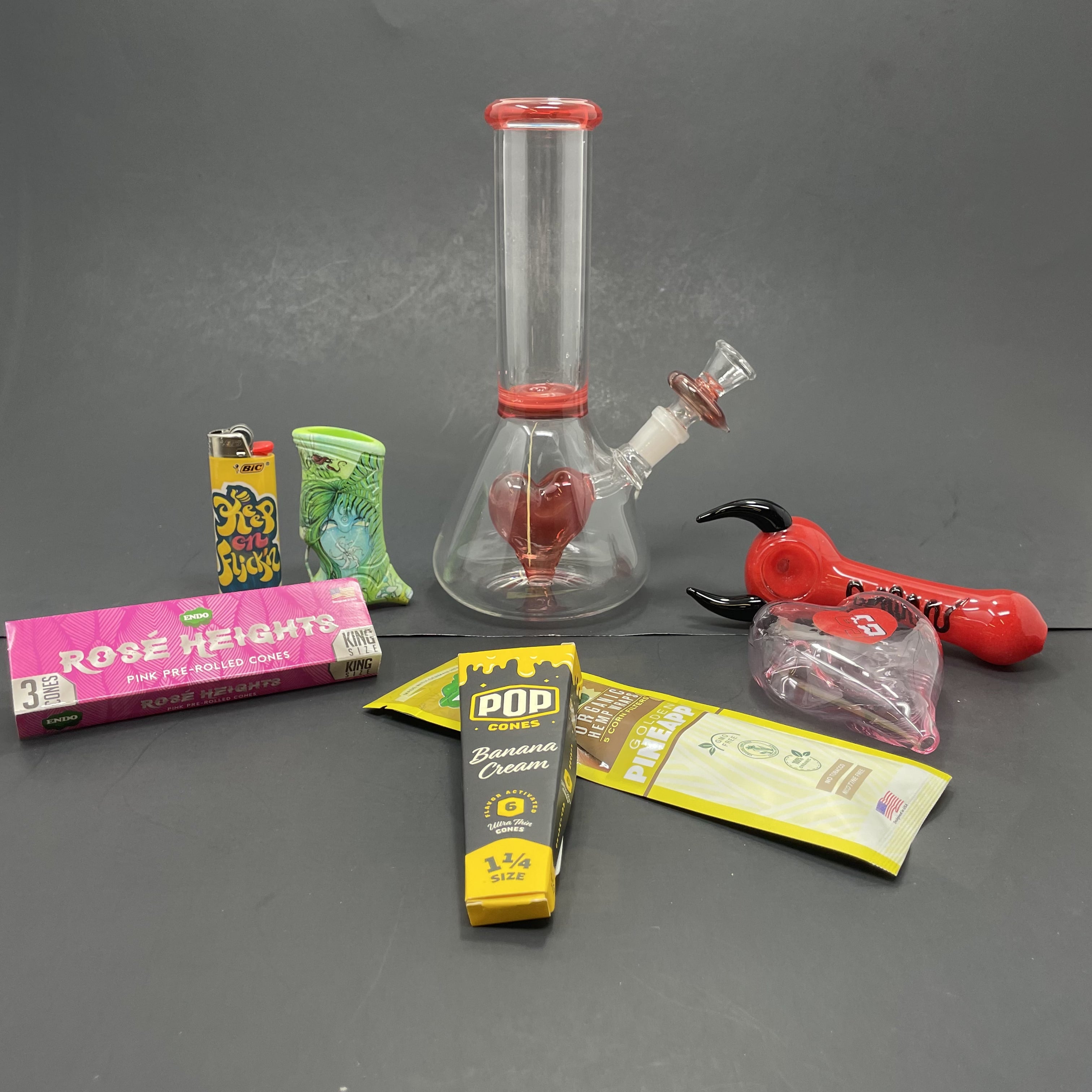 I took pictures to upload but I’m not sure I can! Regardless, everything came EXACTLY like in the photo (except the lighter & lighter holder, which was a tattoo-style rose lighter and a trippy/stoner multicolored holder). The 8” bong came with a little bowl that has a sort of tear drop shaped design, everything works and looks perfect! Also, the heart pipe says “SG” on a small heart decal if you can’t see it in the photo. The glass feels like good quality and was packaged very safely, coated with layers of bubble wrap etc, and took 11 days to come in after the order was placed. I did experience a slight delay with the shipping, but overall it’s amazing and I’m still shocked at the affordability!