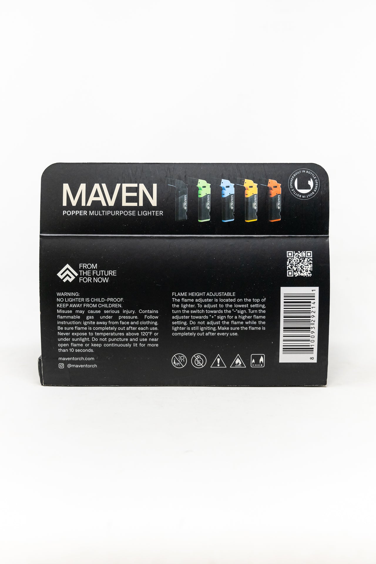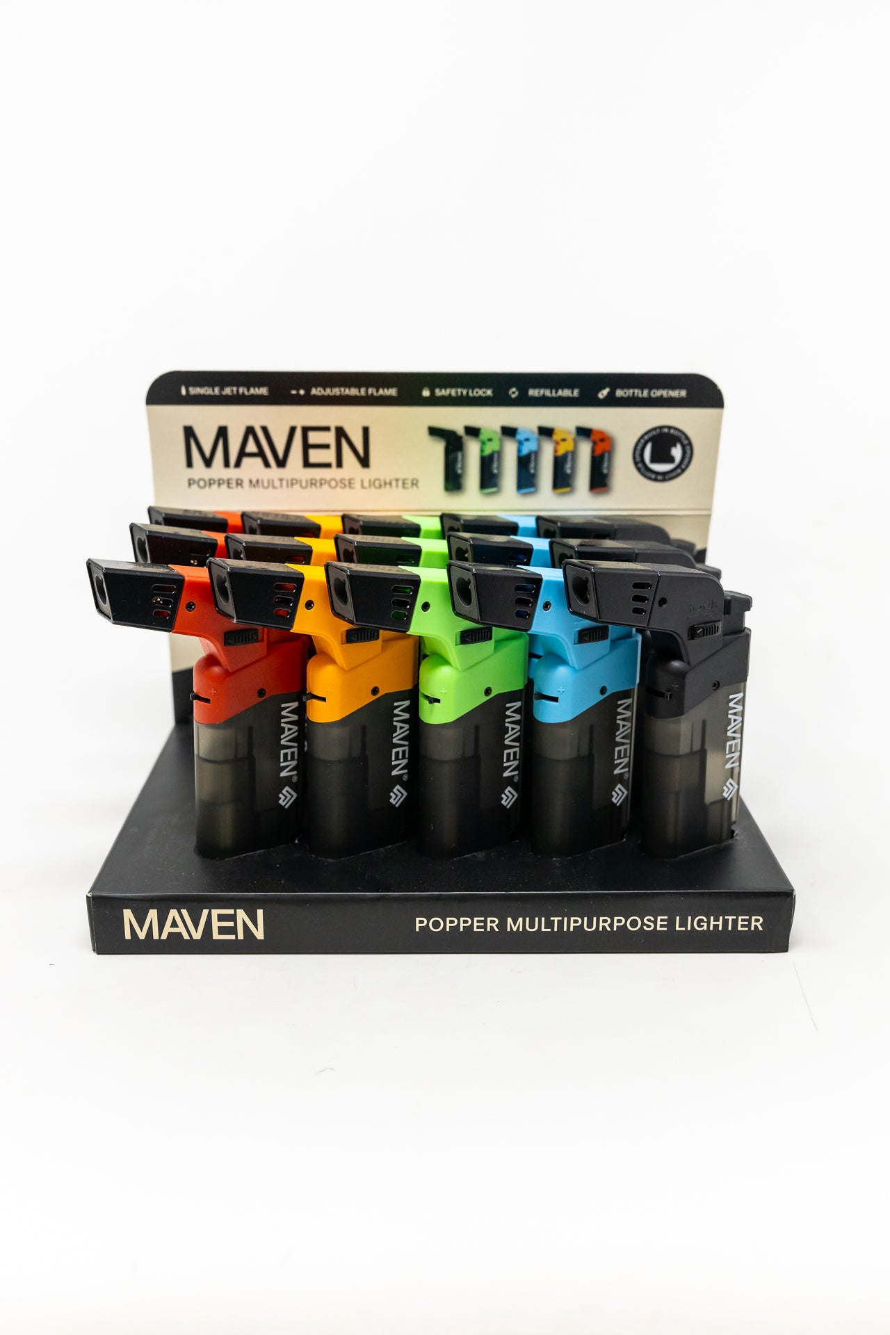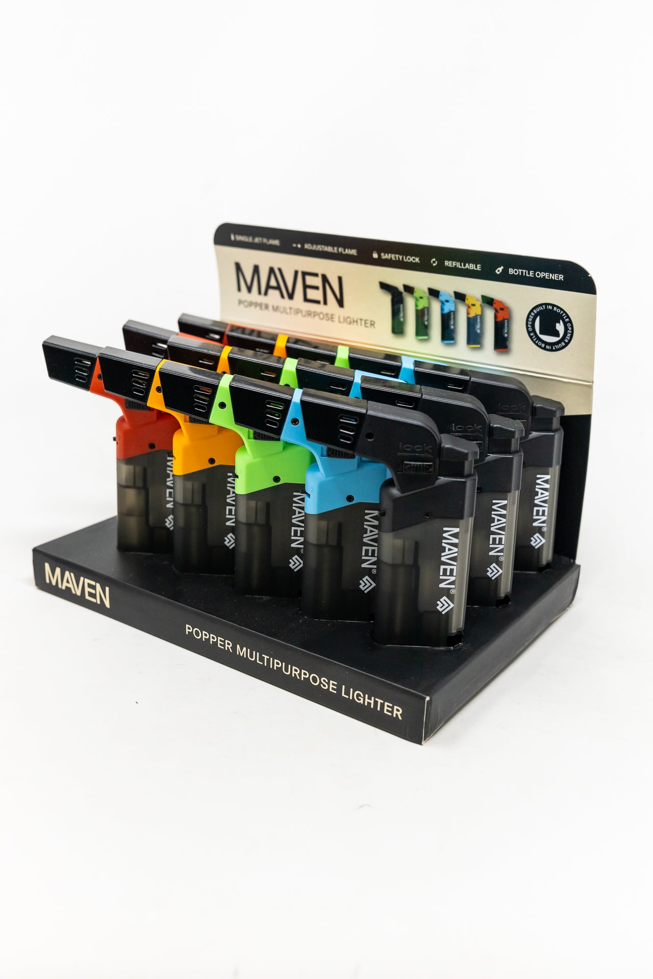 This Maven Torch Bottle Opener and Windproof Lighter is the perfect tool for your home bar. The torch-style lighter is windproof and provides a clean and reliable spark. With a built-in bottle opener, you can enjoy your favorite beverages at any time.