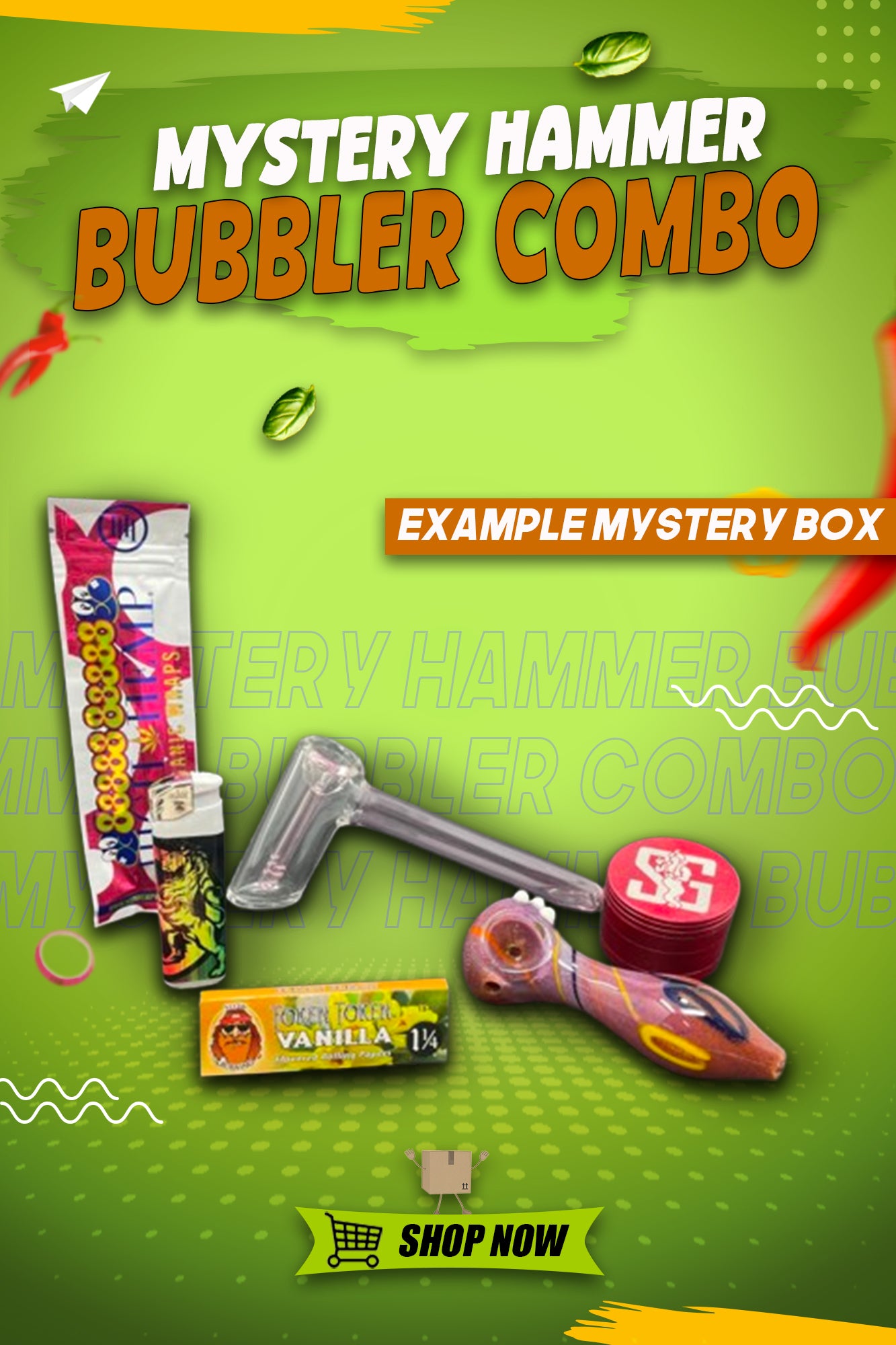 Experience the ultimate smoking experience with our Mystery Hammer Bubbler Combo. This 7" hammer bubbler comes with a grinder, pipe, paper, wrap, and lighter, all in one convenient set. Get ready to enjoy a smooth and flavorful smoke with our mystery combo.