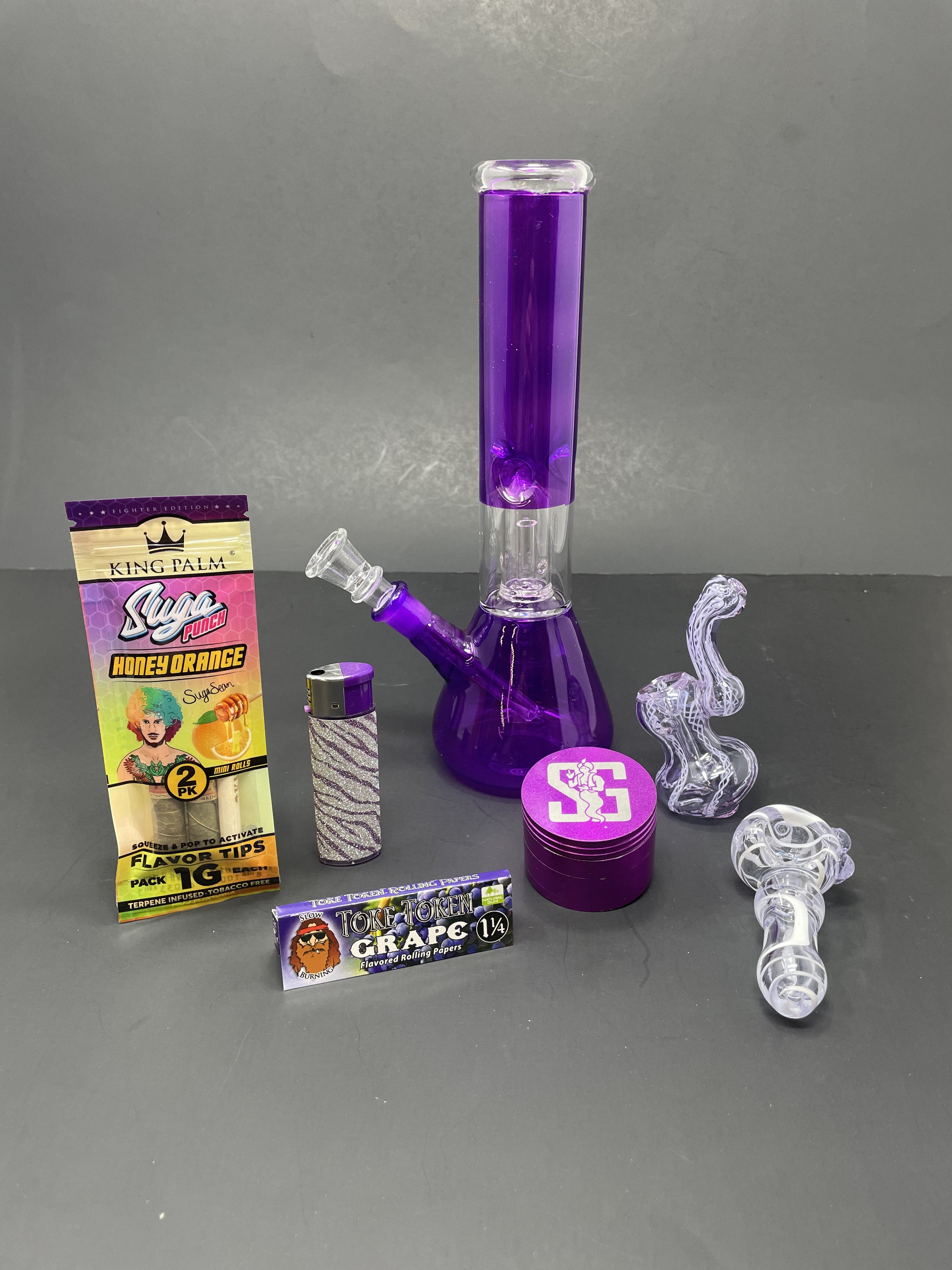 Unleash your inner creativity with the Purple Haze Combo! Featuring a 10" single perc bong and a 3.5" zig zag pipe, this combo will elevate your smoking experience. Enjoy the smooth hits with the lavender glass bubbler and grind your herbs to perfection with the stoned genie grinder. Complete with a King Palm honey orange, a mystery lighter, and Token grape papers. Indulge in the ultimate smoking setup now!