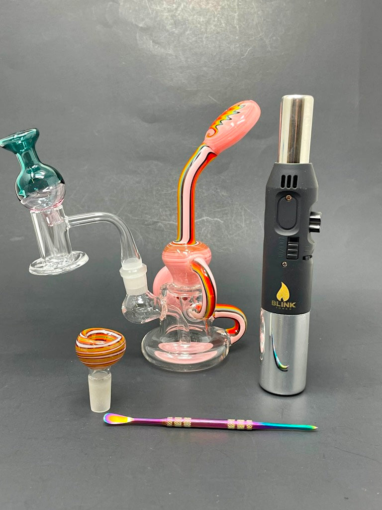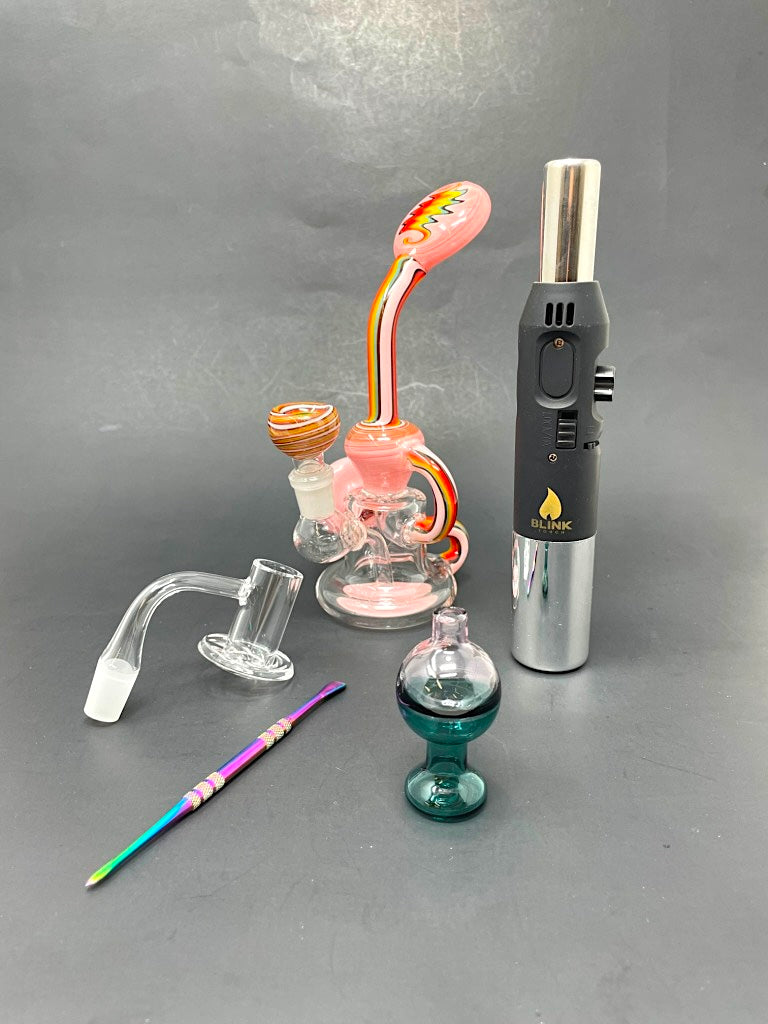 The Rainbow Storm Combo offers a premium dabbing experience with its 8" Pink Rainbow Recycler Dab Rig, Dual Color Bubble Carb Cap, Rainbow Metal Dab Tool, and Fully Weld + Beveled Edge Terp Slurper. Complete the set with the Saber Torch and enjoy clean, flavorful hits every time.