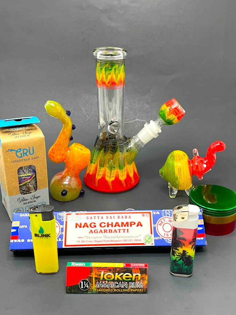 Unleash your inner rasta with the ultimate smoking kit - Rasta Remedy. With a 8" beaker bong, sage smudge stick, Naga Champa incense, neon wind proof lighter, Jamaican rum papers, 4" elephant figurine, 4 pc grinder and Rasta blink lighter, and a 6" bubbler with a carb hole, every hit will be a chill experience.