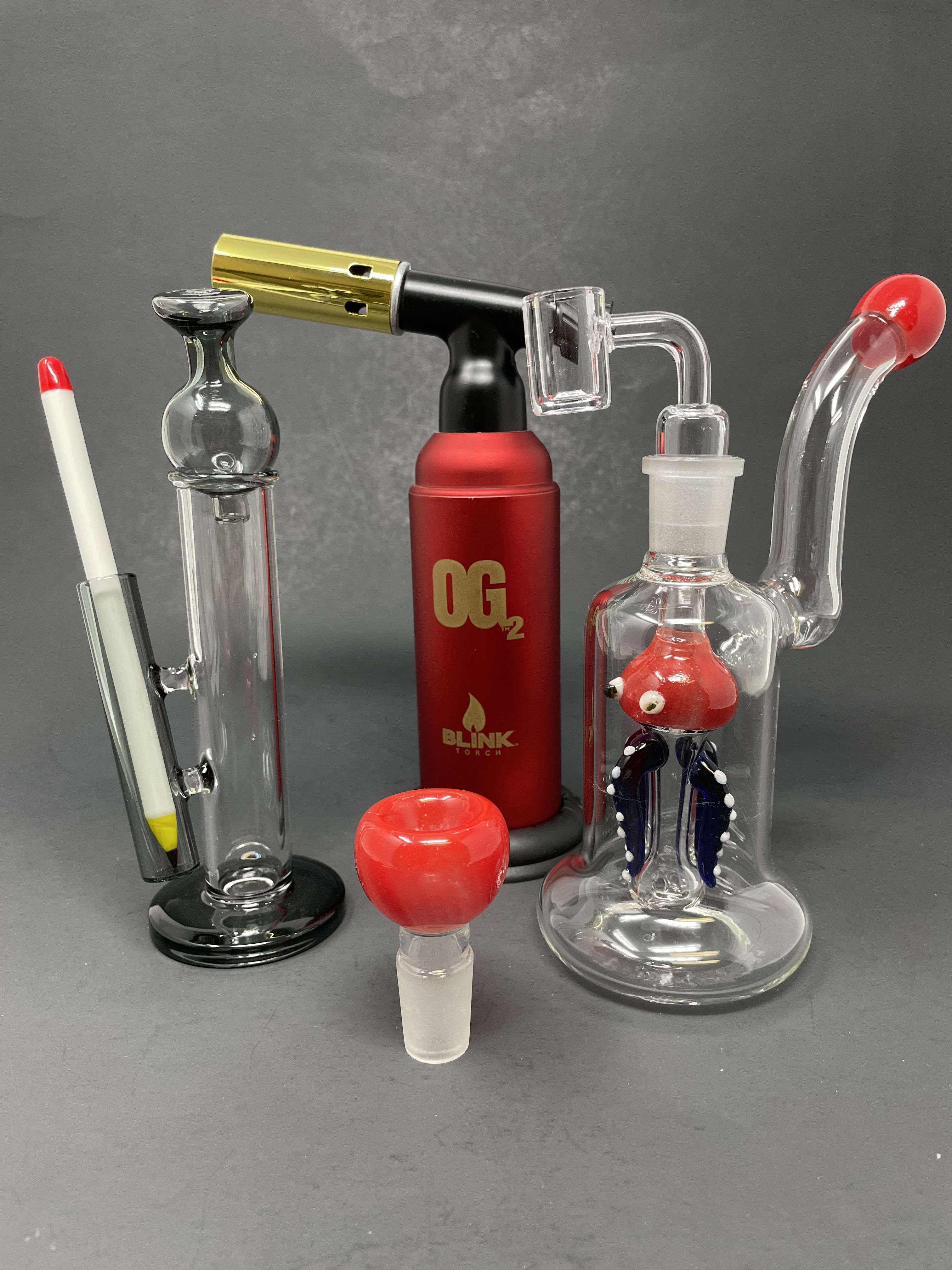 Experience the smoothest hits with the Red Octopus Dab Rig Combo. The included OG Torch allows for an adjustable flame, while the Pencil Glass Dab Tool and Big Bubble Carb Caps ensure a precise and enjoyable dabbing experience. Keep your setup organized with the convenient Dab Stand.