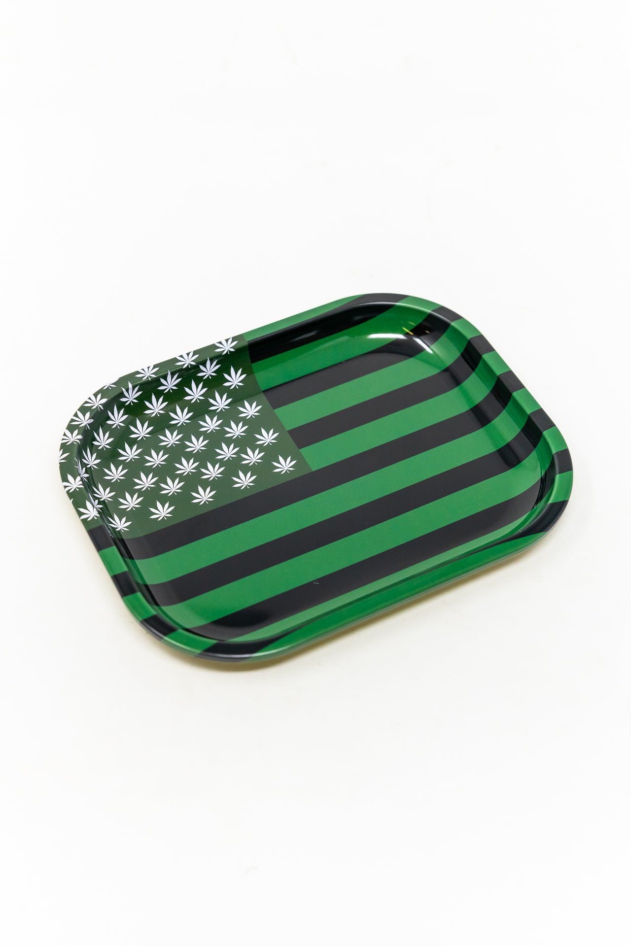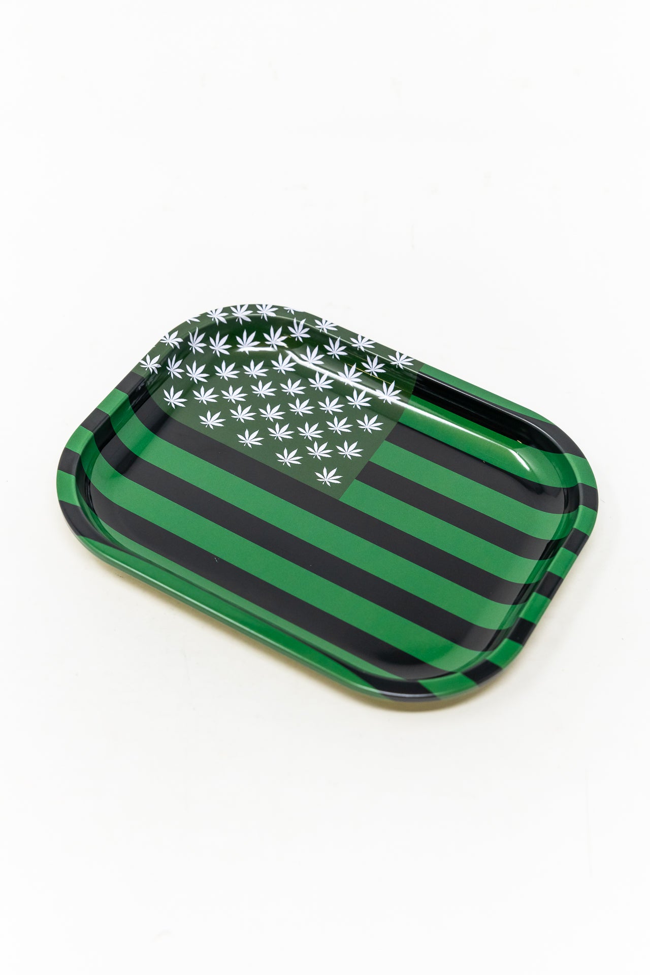 This Small-Green Flag Rolling Tray is perfect for rolling cigarettes and other smoking accessories. Its small size makes it compact and light, making it great for traveling. The non-slip surface ensures that items won't move around during storage, providing a secure option for transportation.