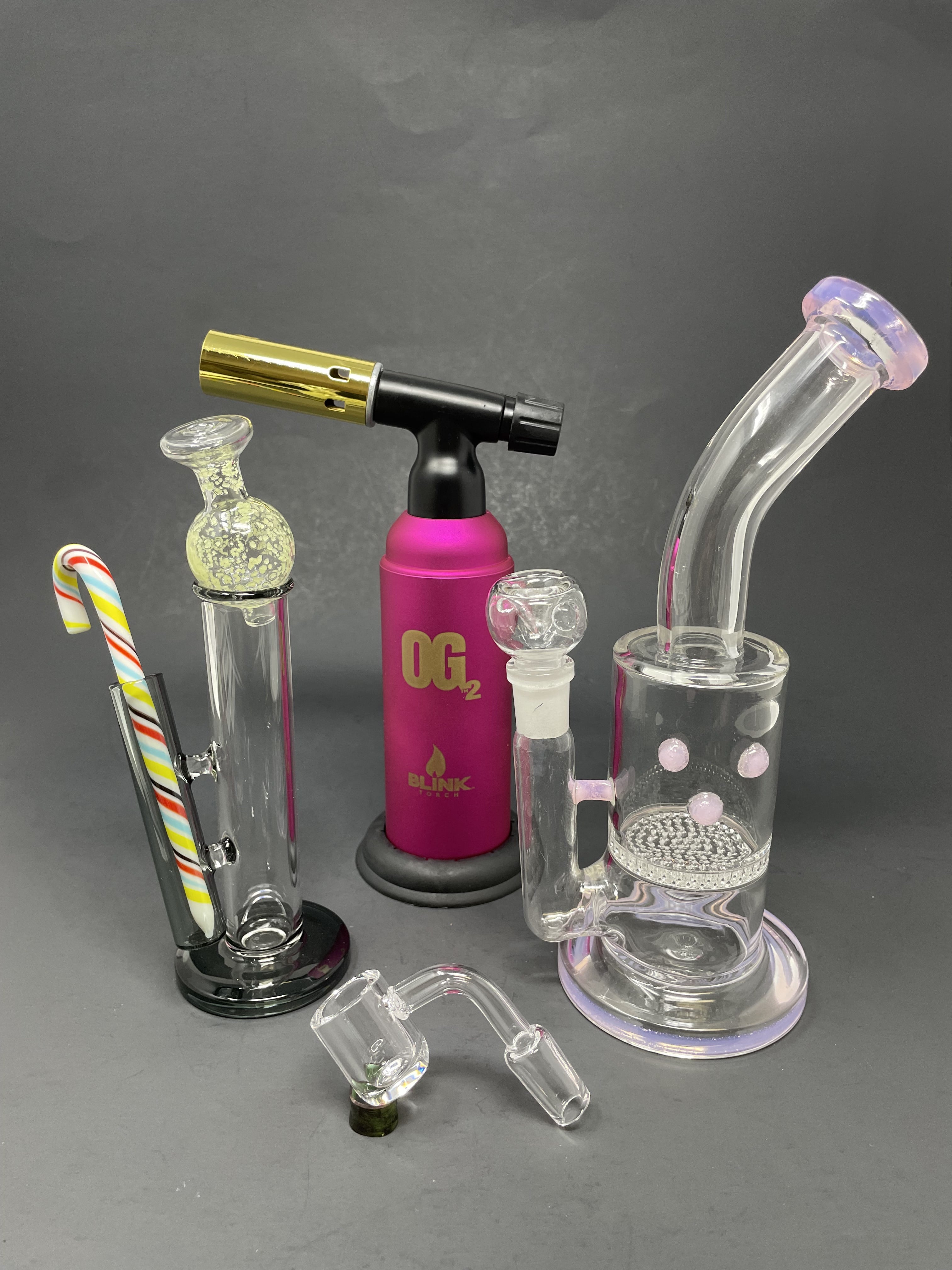 Discover the perfect dabbing set with our Sweet Pink Combo! Featuring a vibrant pink honey comb, an adjustable OG torch, a glow in the dark dab cap, and a 14mm male quartz banger, this set is the perfect addition to any collection. Complete with a dab stand and candy cane dab tool, indulge in a sweet and efficient dabbing experience.